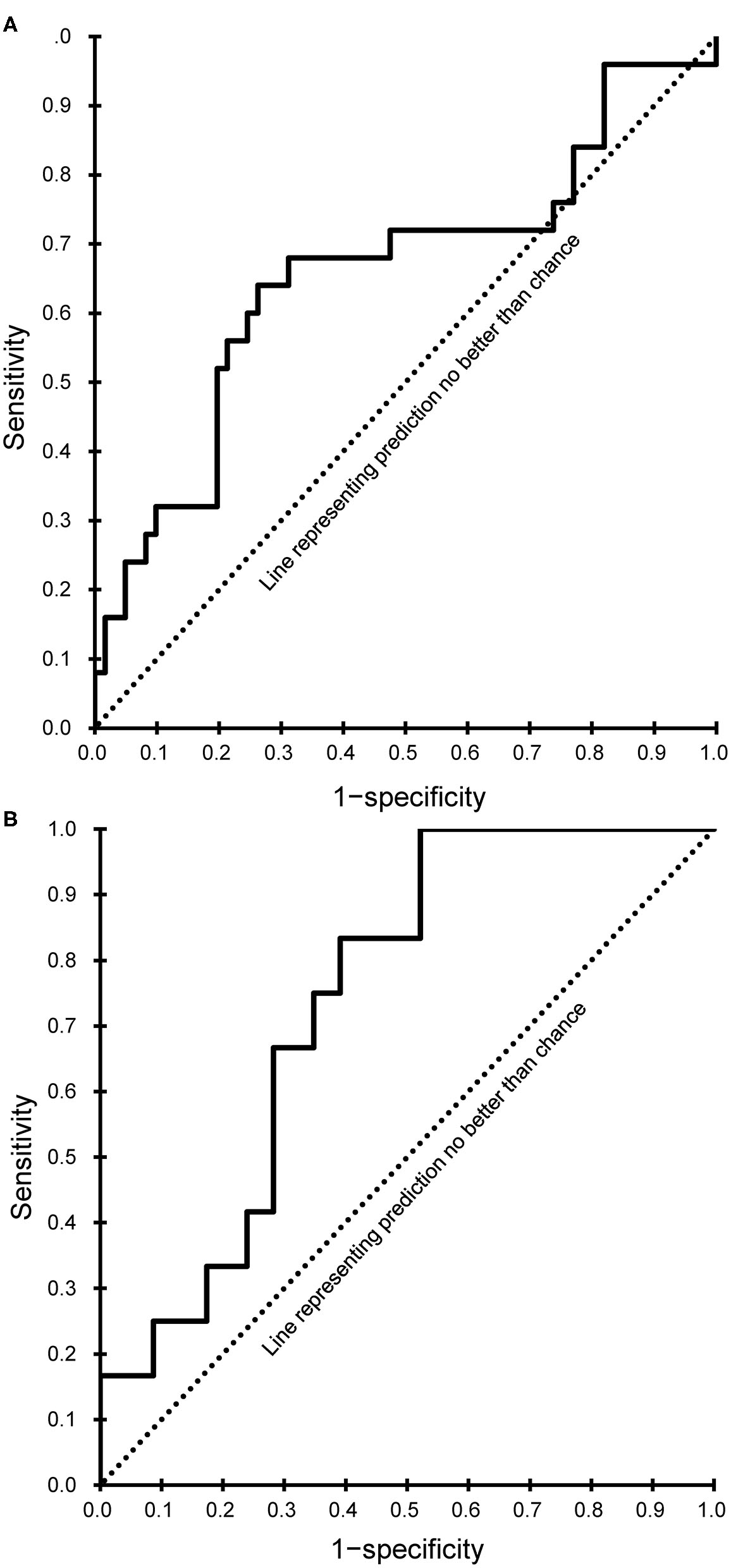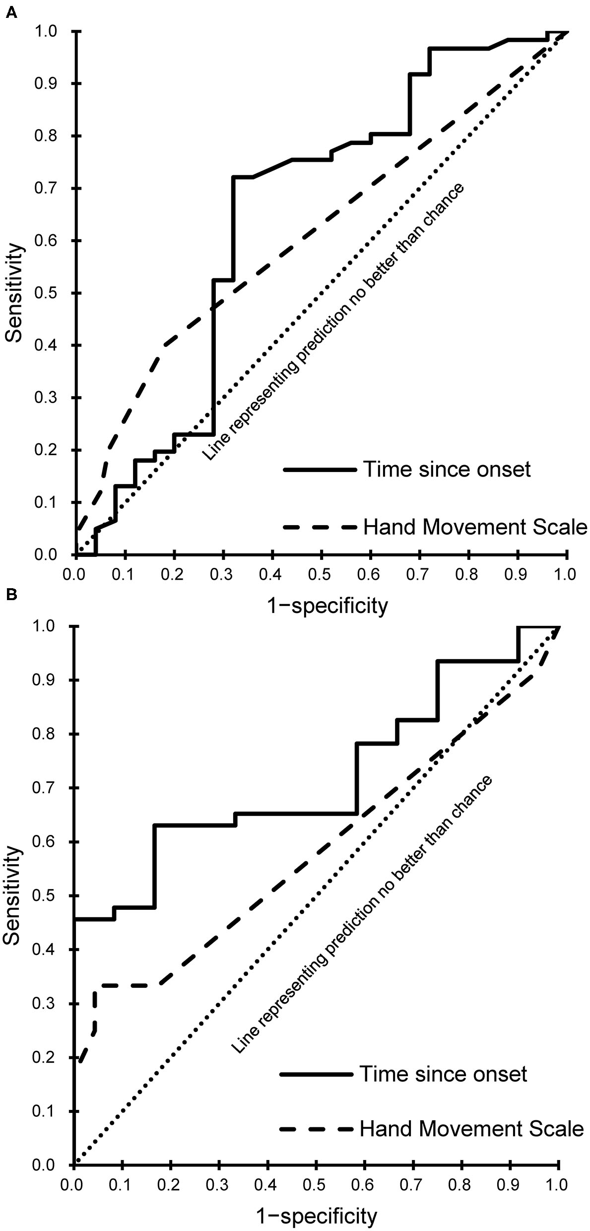 Receiver operating characteristic curves of the meaningful predictors. (A) Subacute phase. (B) Chronic phase.