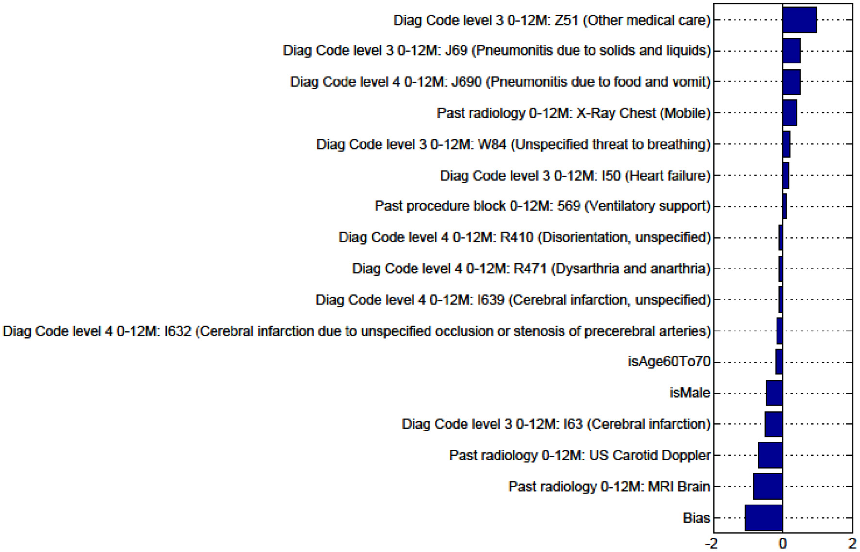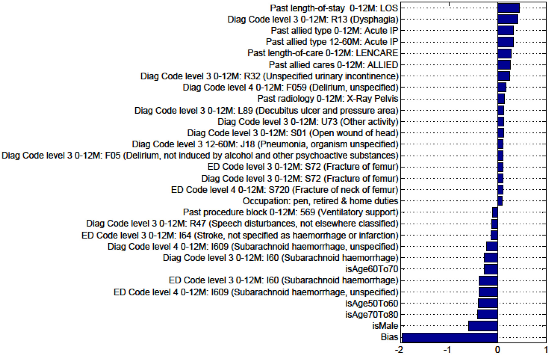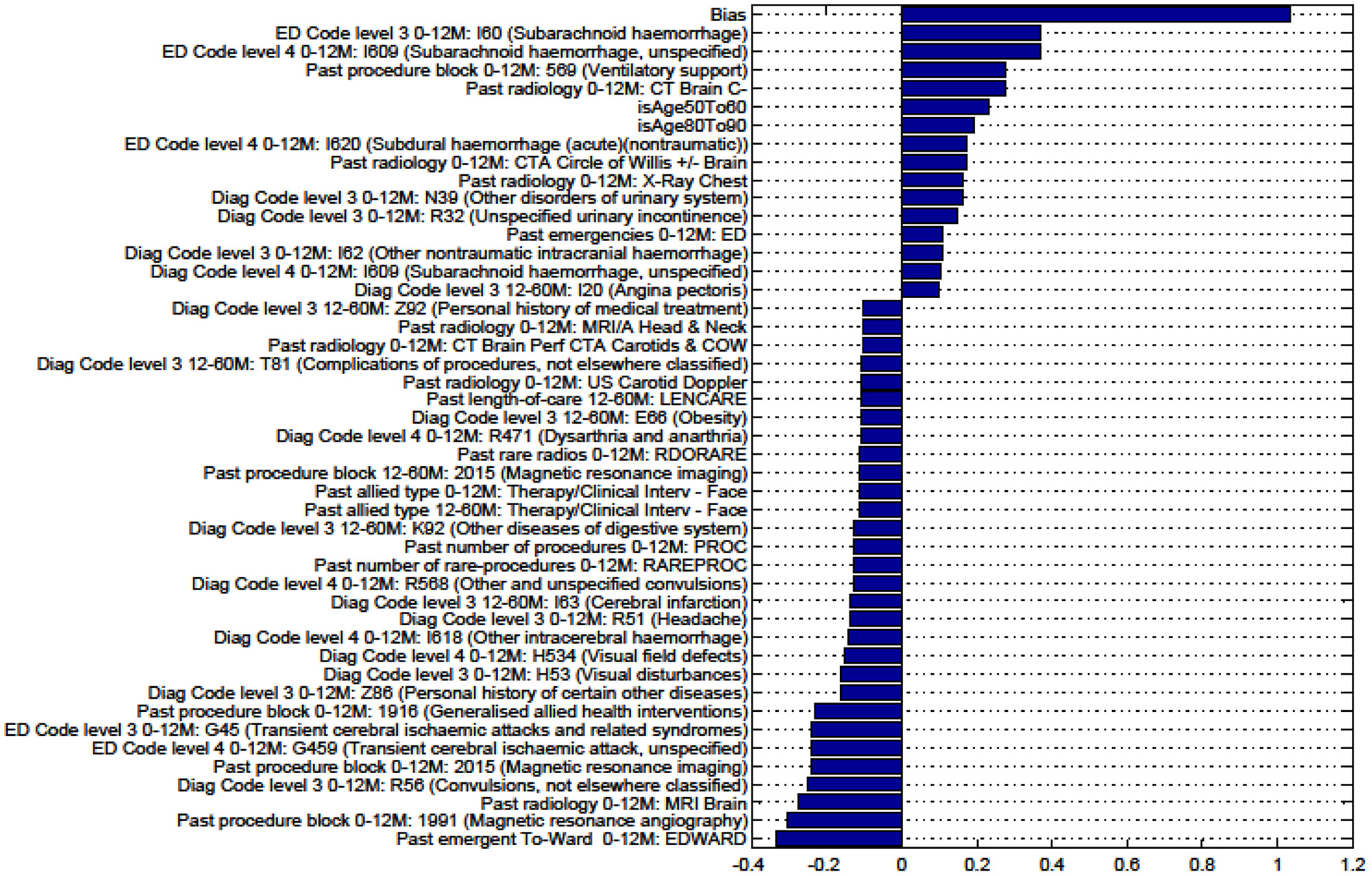 We sought to identify specific predictive factors from our analysis associated with the outcomes we have studied. These factors were items from our administrative data, presented in the figures below as both positively and negatively weighted variables. Table 6 below summarizes factors found to negatively impact the outcome presented. For example, for patients with ICH, patients were less likely to be discharged home vs. to all other discharge destinations (rehabilitation, nursing home, or die in hospital) in older age groups (80–90 years old), had had prior ventilatory support, a history of urinary incontinence, or diagnosis of SAH.