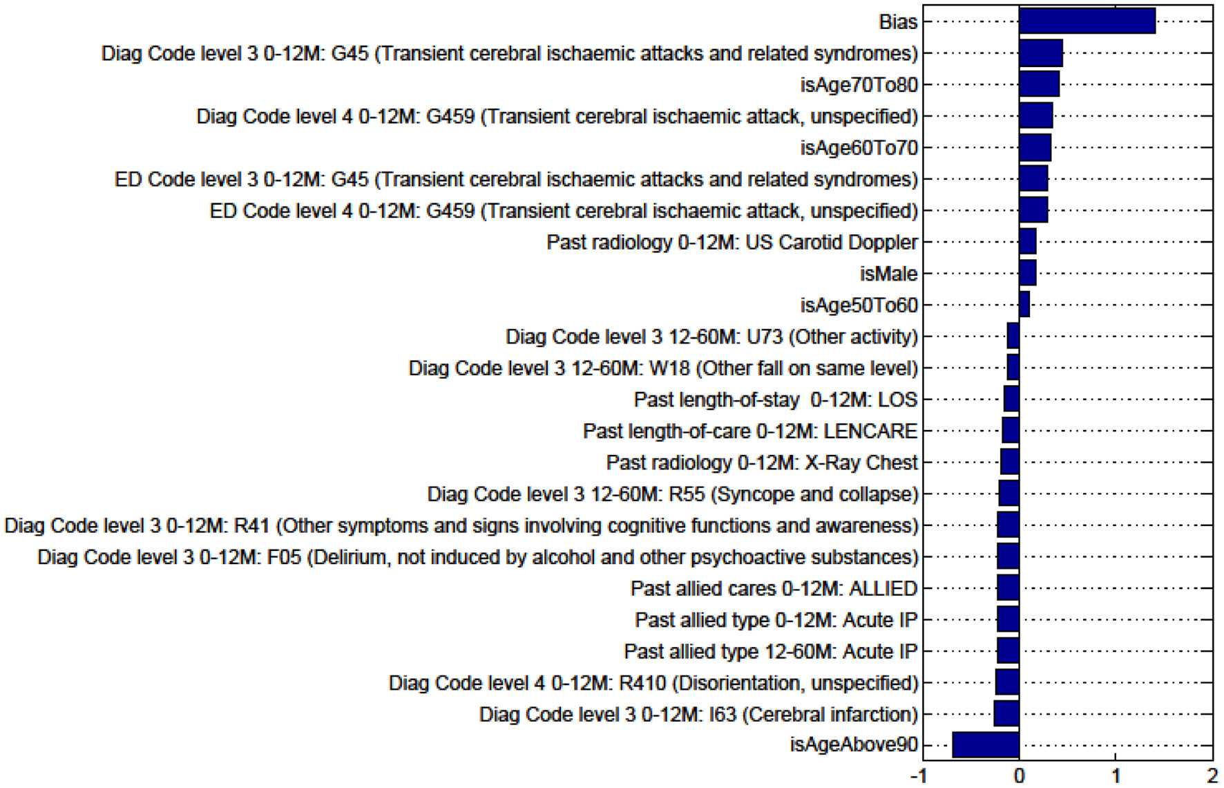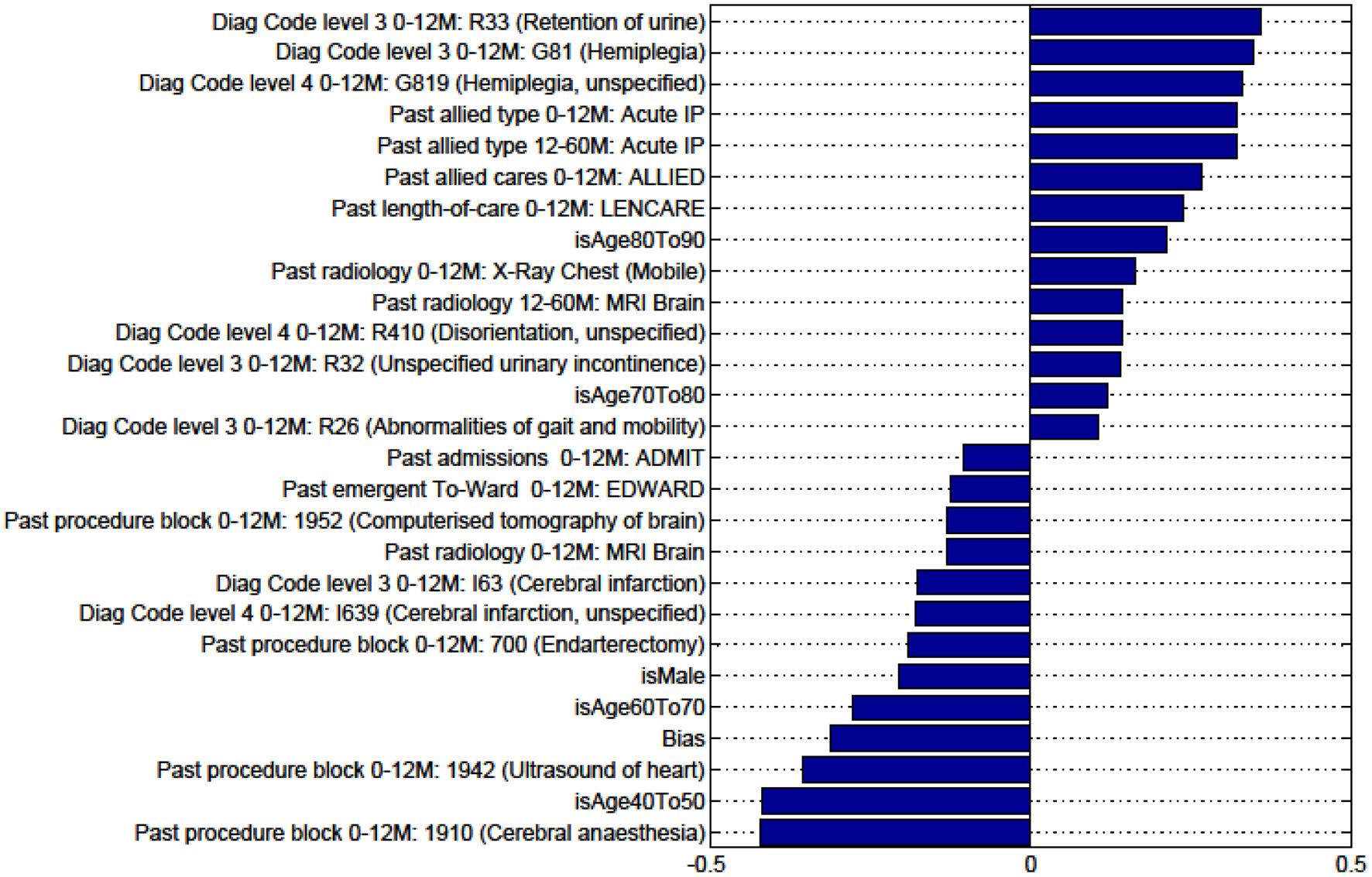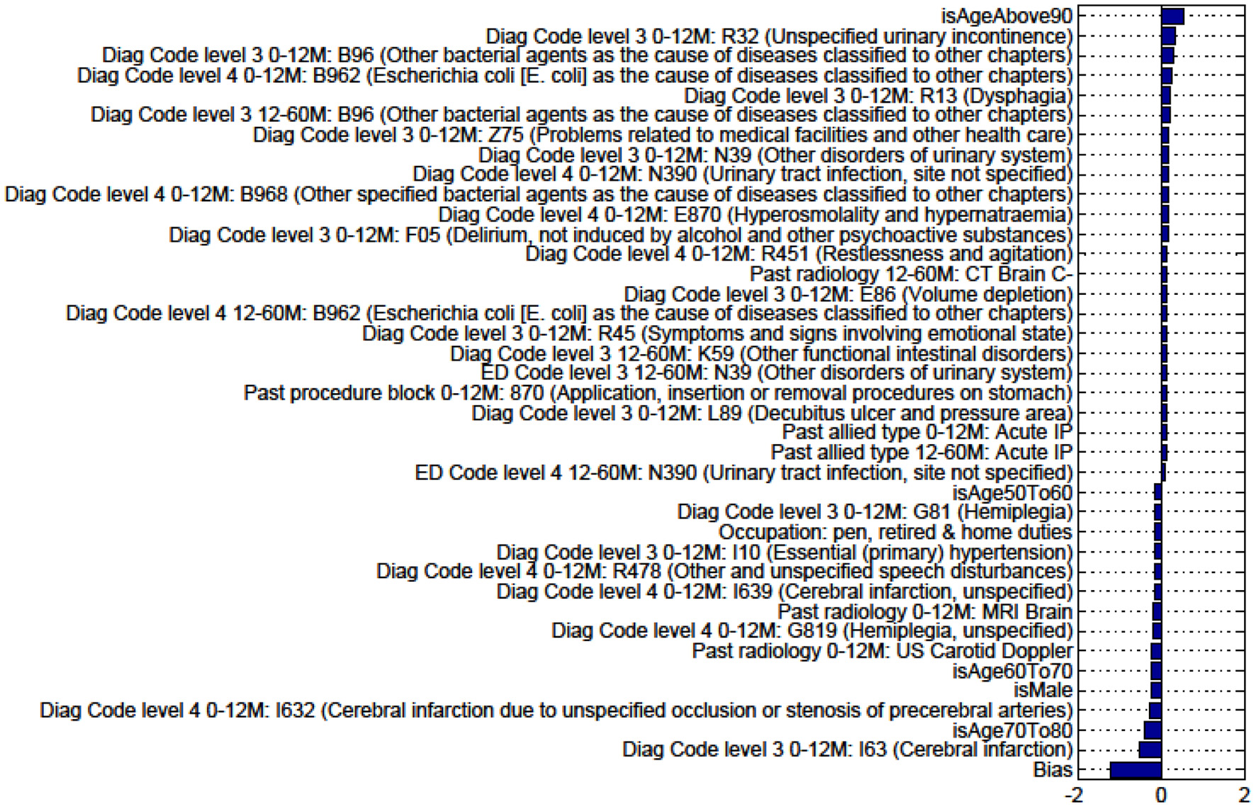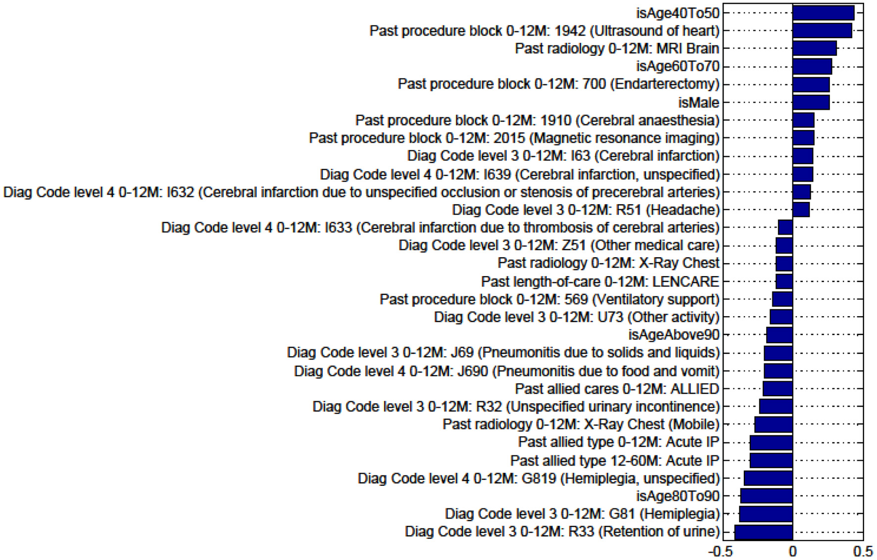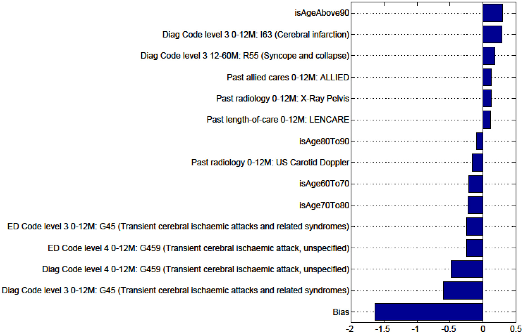 Features constructed from the electronic administrative record which included all available detailed diagnosis, procedure, and administrative data. This included stroke and TIA related diagnostic codes (I60–I69, G45) relating to primary diagnosis, secondary (comorbidity) diagnostic codes, and all available procedure codes relating to patient admissions. The number of variables was 1,303 (some examples of the types of features included can be seen in the data items listed in the Appendix Figures).