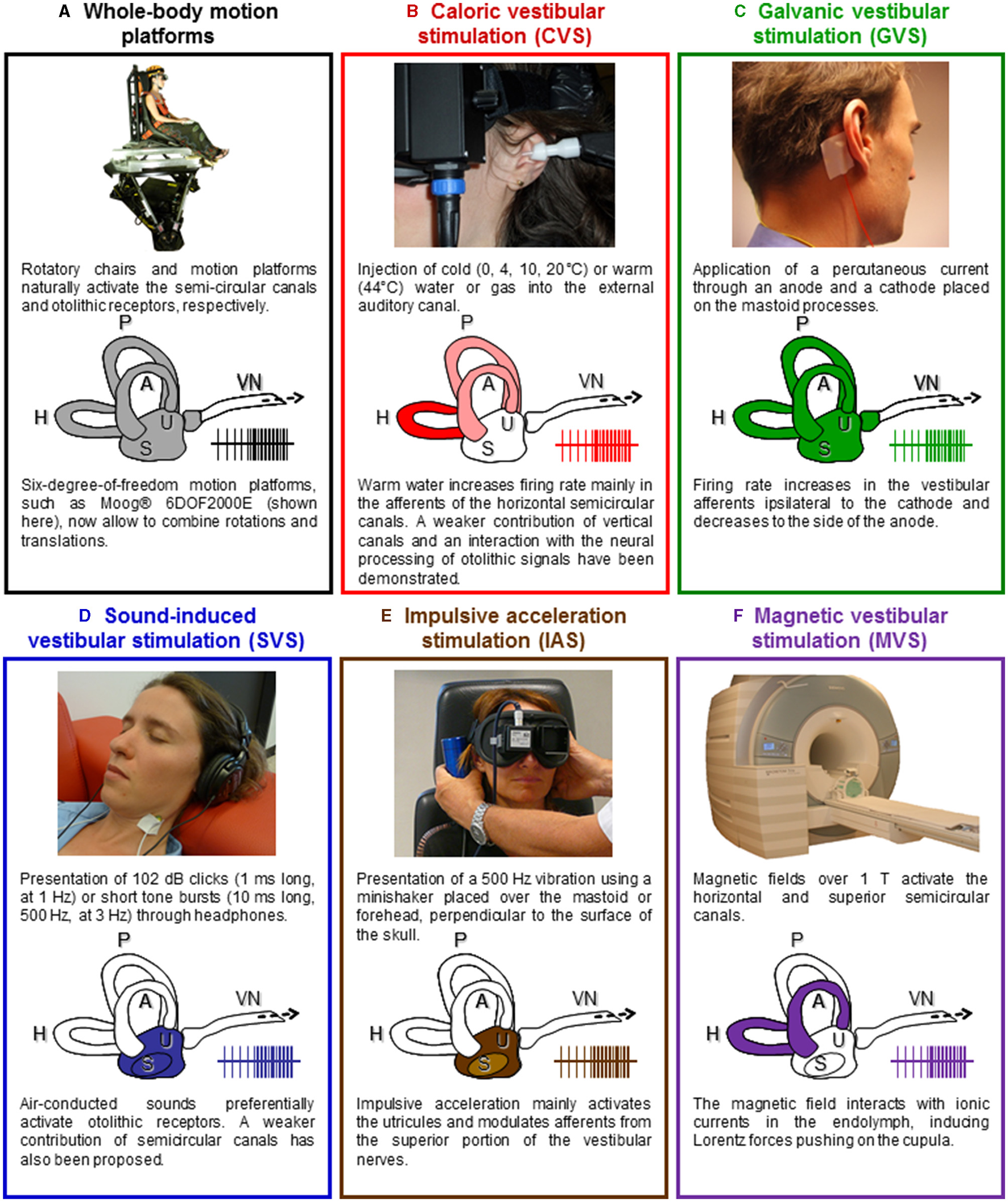 Vestibular stimulation techniques. (A) Rotating chairs stimulate the semicircular canals and linear motion platforms and tilting devices deliver natural stimulation to the otolithic receptors (the utricule and the saccule). New motion platforms with precise control of the amplitude, acceleration, and velocity of passively applied movements now allow to study responses to complex natural vestibular stimulation. Illustration adapted with permissions from (62). (B) Caloric vestibular stimulation (CVS) consists of irrigating the external auditory canal with warm or cold water or airflow. Caloric vestibular stimulation evokes a nystagmus and self-motion perception, often leading to vertigo and a sensation of dizziness. Illustration adapted from (15) with permissions from Elsevier. (C) Galvanic vestibular stimulation (GVS) consists of applying a weak transcutaneous current through an anode and a cathode placed over the mastoid processes. The cathode increases the firing rate in the ipsilateral vestibular afferents, while the anode decreases it. GVS stimulates simultaneously all otoliths and semicircular canals afferents. Illustration adapted from (15) with permissions from Elsevier. (D) Auditory stimuli such as clicks and short-tone bursts can stimulate the otolithic receptors. Illustration adapted from (15) with permissions from Elsevier. (E) 500 Hz vibrations applied on the mastoids or the forehead using a minishaker stimulate the otolithic receptors and induce ocular and cervical VEMPs. Illustration adapted from (63). (F) Based on the analysis of the nystagmus it evokes, magnetic vestibular stimulation (MVS) is thought to activate the horizontal and superior semicircular canals. It offers a way to produce long-duration vestibular stimulation, equivalent to a constant angular acceleration on a motion platform. A, H, P, anterior, horizontal, and posterior semicircular canals; S, saccule; U, utricule; VN, vestibular nerve.