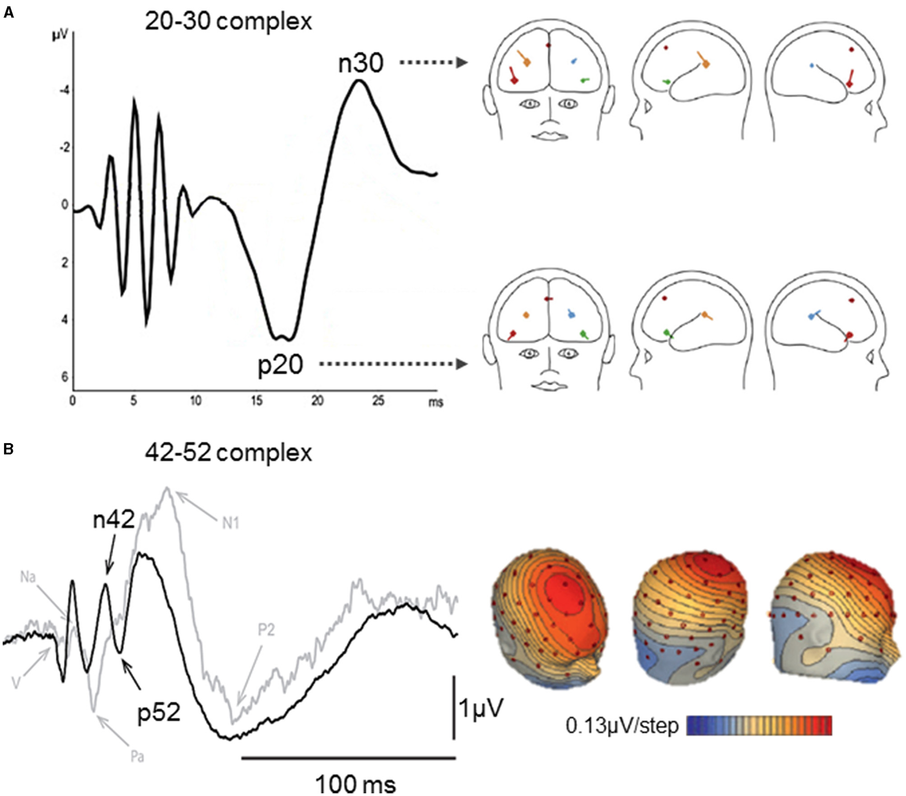 Middle latency vestibular-evoked cerebral potentials (VestEPs). (A) The left part shows the 20–30 complex observed with a Laplacian montage (FC1 + FC2 + IO) – (TP9 + TP10), after short latency responses appearing within 10 ms. The right part shows BESA regional source activity for the p20 and n30 components, showing the junction of the anterior insula with the inferior frontal gyrus in the right hemisphere (bright red), the posterior parietal operculum (bright blue), a frontal source near areas 2v, 3aNV, and the frontal eye fields (dark red), the left inferior frontal gyrus (green), the left parietal operculum (brown). Adapted from (111) with permissions from Elsevier. (B) Left panel: Grand means of evoked potentials showing the n42–p52 response under electrode FCz after right acoustic stimulation in 10 healthy subjects (black curve) and a patient with a unilateral vestibular loss (gray curve). Right panel: Scalp voltage maps at 42 ms after acoustic stimulation (+18 dB above the vestibular threshold). Positive potentials are indicated in blue and negative in red and contours are spaced at 0.13 μV. Adapted from (42).
