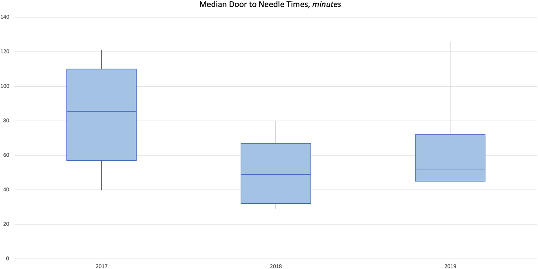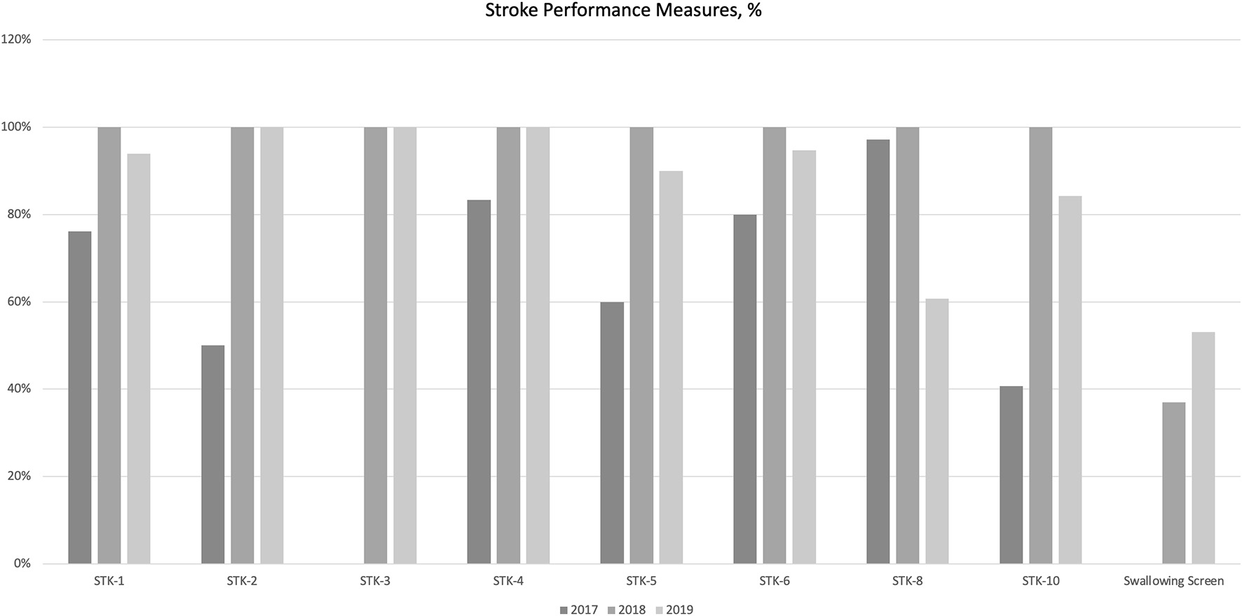 Results: A total of 143 patients were admitted for acute ischemic stroke, TIA, or hemorrhagic stroke. Of these, 36 were admitted in 2017, 50 in 2018, and 57 in 2019. Performance measure proficiency increased in the year-over-year analysis as did the total number of patients and the number of patients treated with IV thrombolysis and MT.