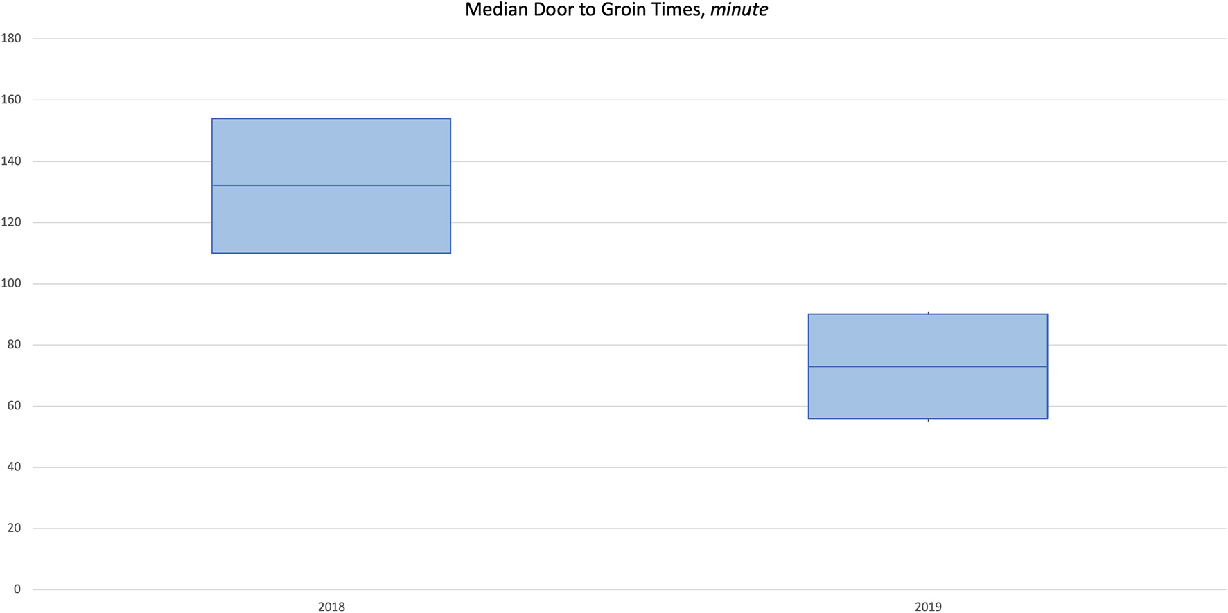 There was a significant negative correlation between year and median door to neurological evaluation by neurologist/ED physician (coefficient = −12, p = 0.007) and a significant positive correlation between year and median lab turnaround time (coefficient = 8.5, p = 0.001; Supplementary Table 4). Door to needle time (min) median (IQR) was 85.5 (57–110) in 2017 and improved to 52 (45–72) in 2019 (Figure 3). Median (IQR) door to groin puncture (min) also improved from 132 (110–154) in 2018 to 73 (56–90) in 2019 (Figure 4). The time from groin puncture to recanalization was evaluated retrospectively. In 2018, these data points were not being documented and therefore not available. However in 2019, documentation of these time points became required and the median (range) for 2019 is 51 min(19–60). For all years, median door to stroke protocol activation time and median door to neurological assessment time met the goal of 10 and 25 min, respectively.