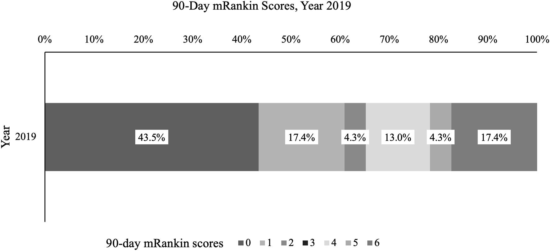 There was no statistically significant difference in mean length of hospital stay across years, stratified by type of stroke (Supplementary Table 5). Mean (SD) length of hospital stay for any stroke patient was comparable year to year. Data for 90 day mRS was not available for all years as the collection of 90 day mRS was implemented in 2018; of those with documented mRS in 2019 (n = 23), 10/23 (43.5%) had a score of 0, 4/23 (17.4%) of 1, 1/23 (4.3%) of 2, 3/23 (13.0%) of 4, 1/23 (4.3%) of 5, and 4/23 (17.4%) of 6 (Figure 5).