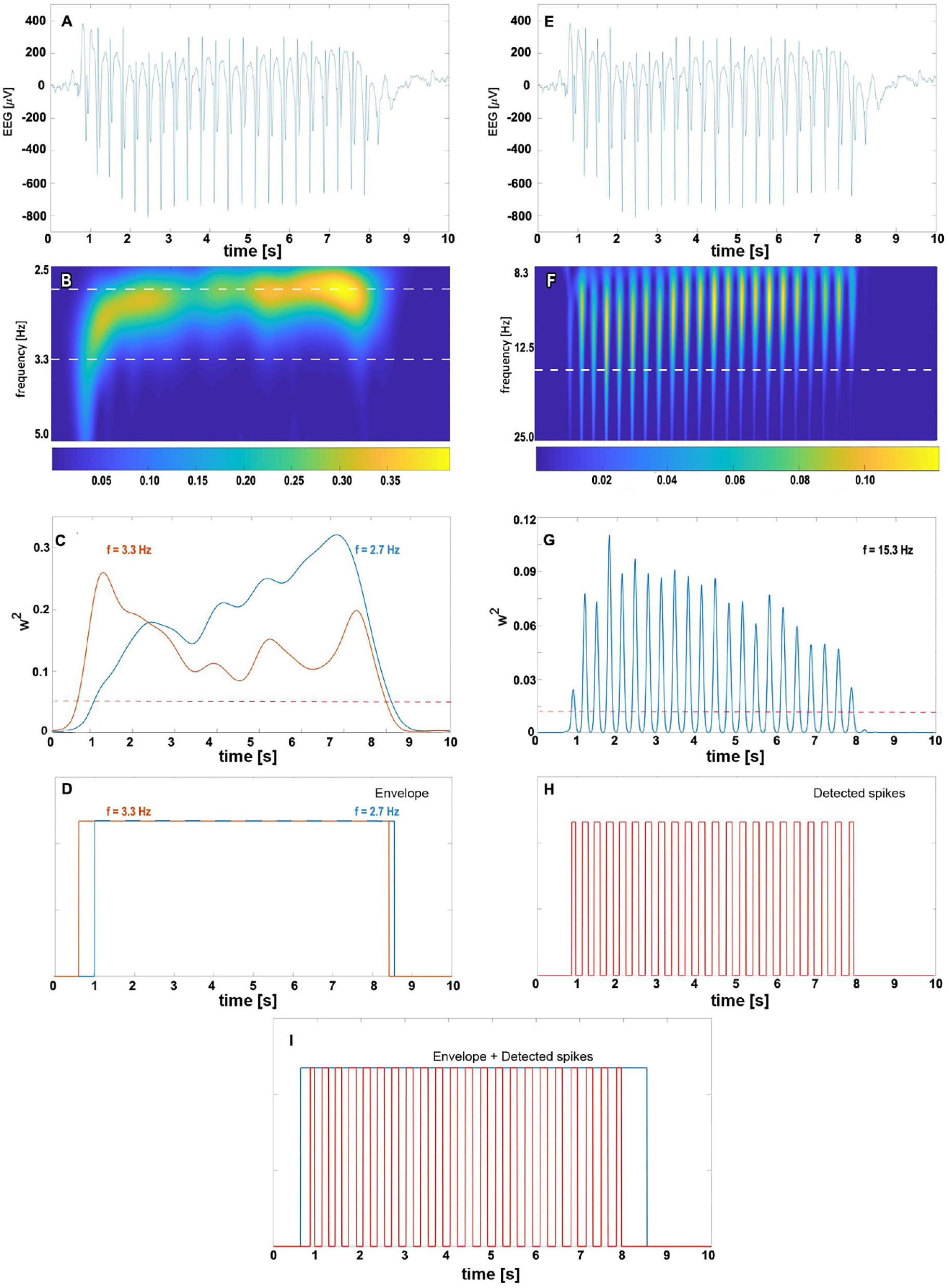 Figure 2. The complex Morlet wavelet analysis of absence slow wave (B–D) and spikes (F–H). For clarity, absence EEG is presented at the top of both columns (subplots A,E). The density map (B) shows the time evolution of normalized wavelet power for pseudo-frequencies in [2.5, 5] Hz range. The 2.7 and 3.3 Hz cuts (marked with the white horizontal dashed line) are plotted in subplot (C) with the blue and orange lines, respectively. We refer to time intervals during which the wavelet power for these frequencies exceeds the predetermined threshold (represented in (C) by the red dashed horizontal line) as the slow-wave envelopes. For a given seizure, the total envelope is obtained by merging 2.7 and 3.3 Hz envelopes as shown in (D). The right column shows the complex Morlet analysis with parameters tuned to spike detection. The prominent ridges in wavelet power density map (F) and peaks in 15.3 Hz cut (G) are manifestations of seizure's spikes. The white horizontal dashed line in (F) corresponds to the spike frequency 15.3 Hz obtained in the grid search. The train of unit pulses in (H) indicates time intervals during which wavelet power for 15.3 Hz is greater than the spike threshold value (marked in subplot (G) with the red dashed horizontal line). An absence is detected whenever the epileptic spikes are found in the slow-wave envelope (I).