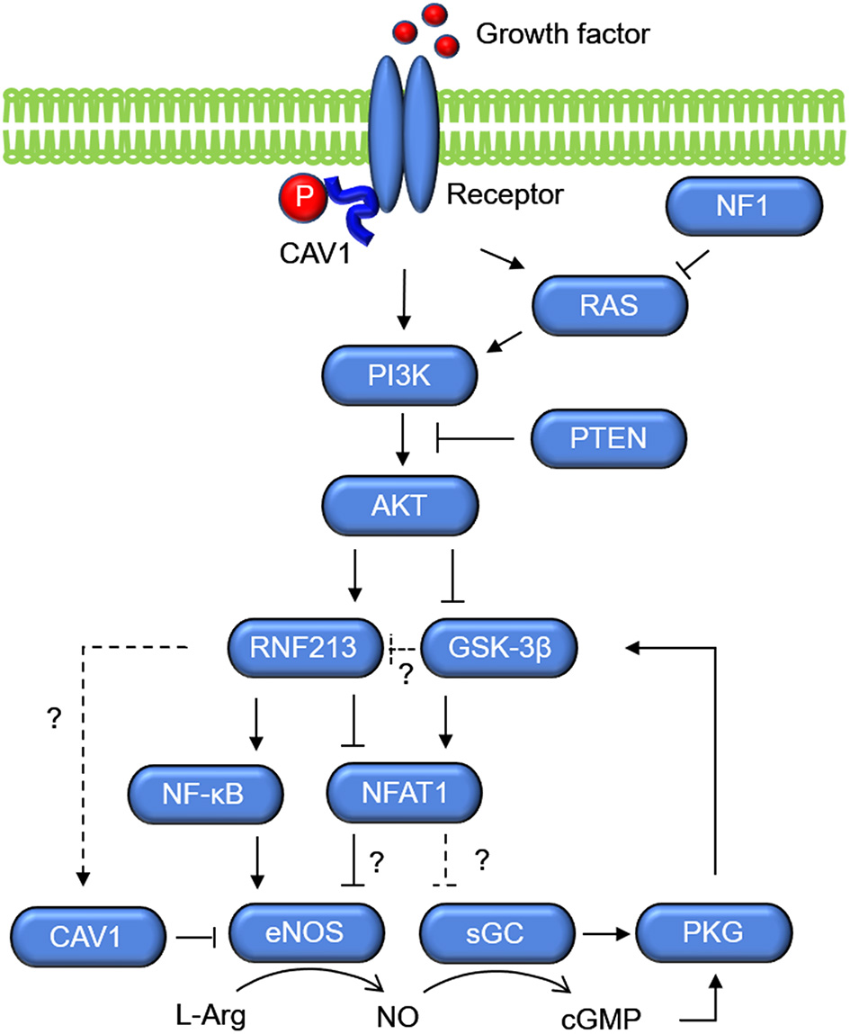 Molecular networks of RNF213 and GUCY1A3 (sGC). Growth factors activate PI3K/AKT, which upregulate the expression of RNF213 and eNOS. Activation of PI3K/AKT leads to inactivation of GSK-3β, which increases degradation of NFAT1 by the proteasome possibly via ubiquitination by RNF213. As opposed to the Ca+/Calmodulin/NFAT1 signaling shown in Figure 3, NFAT1 is assumed to suppress eNOS expression in the context of PI3K/AKT. GSK-3β, glycogen synthase kinase-3β; PKG, protein kinase G; sGC, soluble guanylate cyclase.