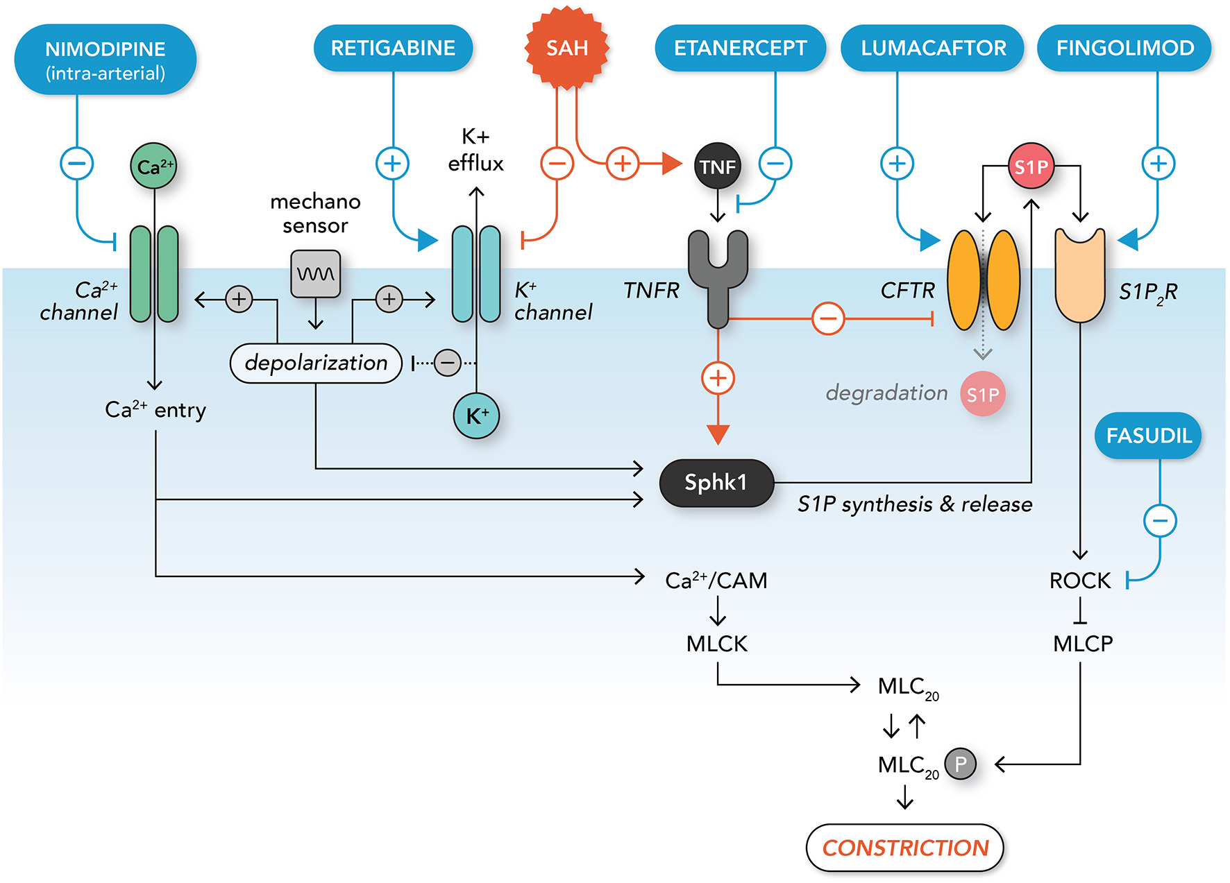 | Yagi et al., 2015 | (87) | Mouse | Olfactory | SAH augments myogenic reactivity and reduces CBF. Etanercept (TNF inhibitor) and JTE-013 (S1P2 receptor antagonist) normalize myogenic reactivity and reduce neurological injury in SAH; etanercept improves CBF in SAH. |