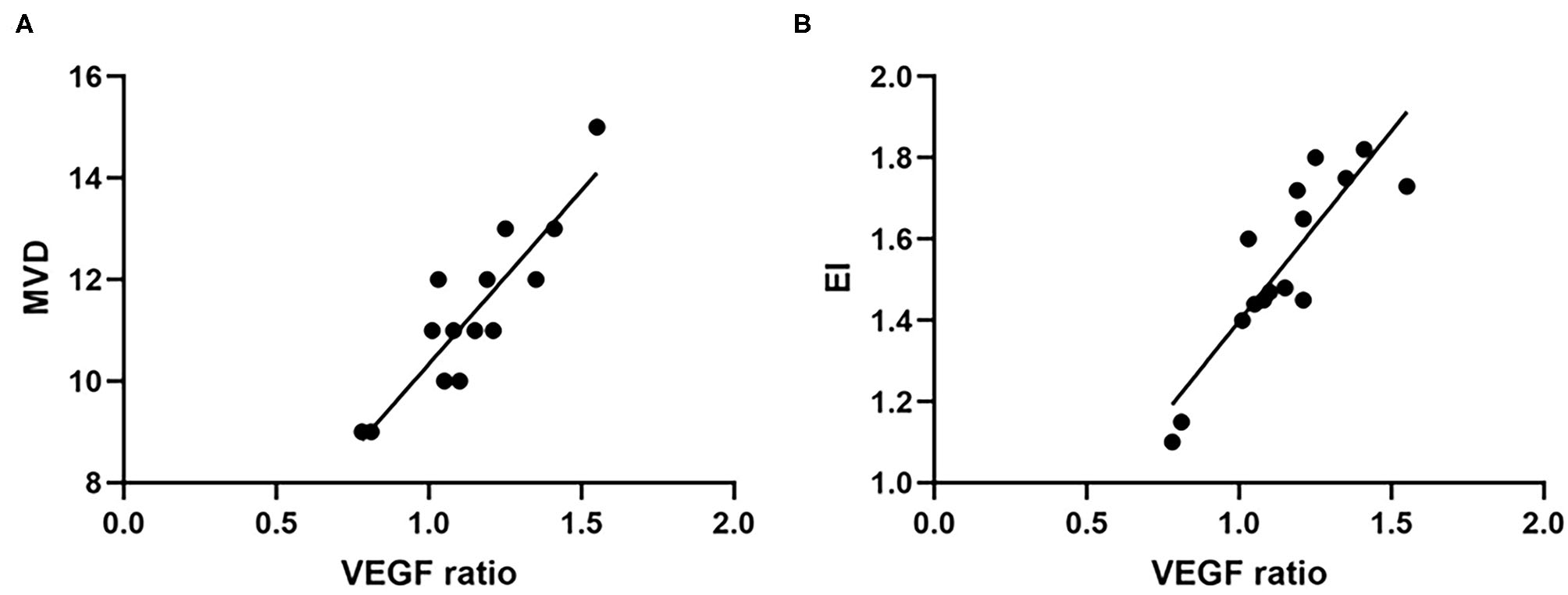 The expression level of VEGF was positively correlated with MVD (A) and EI (B). VEGF, vascular endothelial growth factor; MVD, microvessel density; EI, edema index.