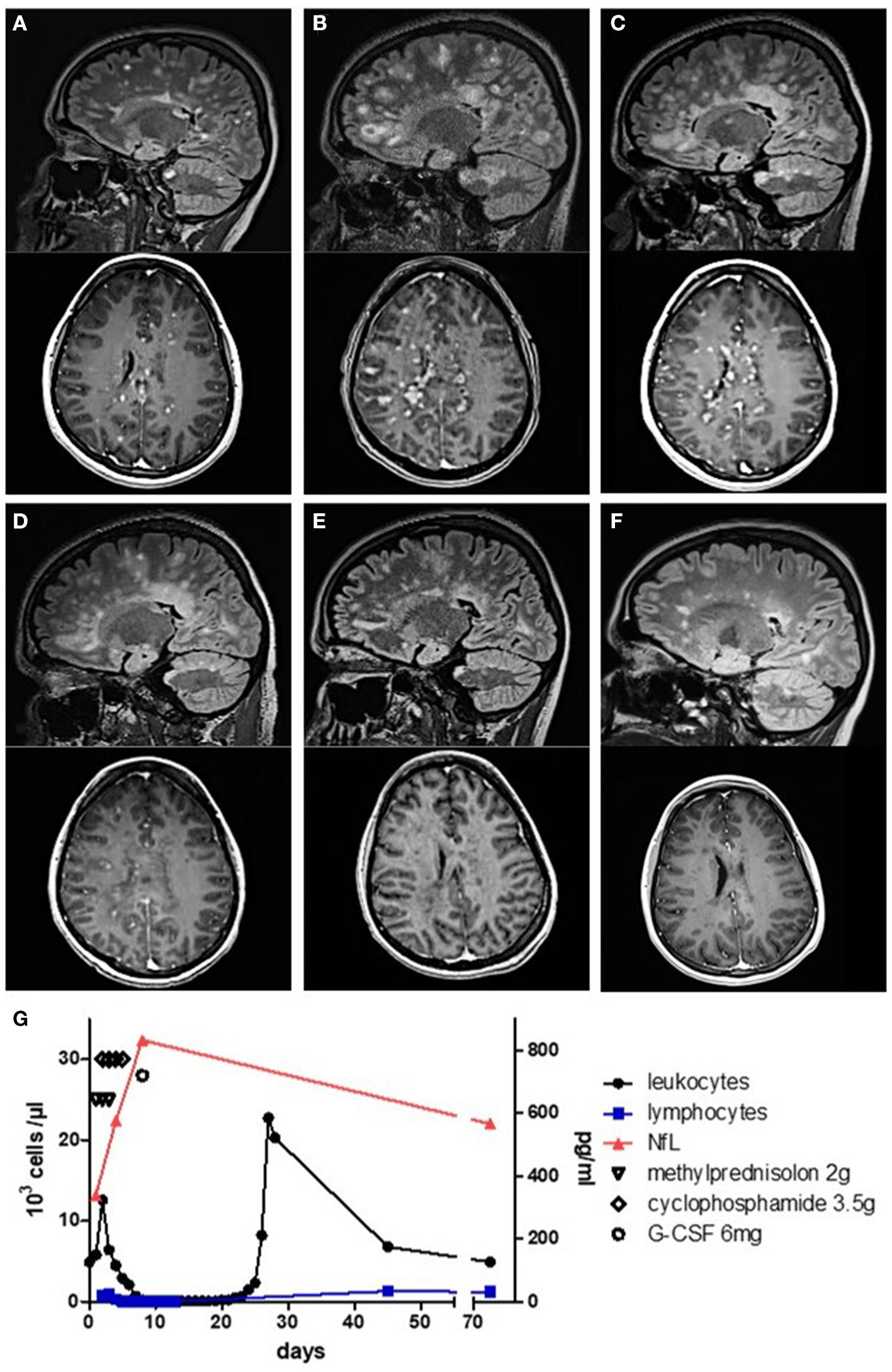 MRI and serological monitoring of the disease course. (A–F) Sagittal FLAIR and axial T1 gadolinium (Gad) sequences. (A) Numerous lesions with Gad enhancement at first admission. (B) MRI at re-admission showing more than 100 Gad-enhancing lesions. (C) Decrease of lesion load 7 days after the first dose of cyclophosphamide. (D) Further decrease of lesion load mirroring clinical remission at 15 days and (E) at 30 days. (F) At 44 days after cyclophosphamide treatment, no more Gad enhancement was detectable. (G) Leukocyte and lymphocyte count as well as serological neurofilament light chain levels during treatment.