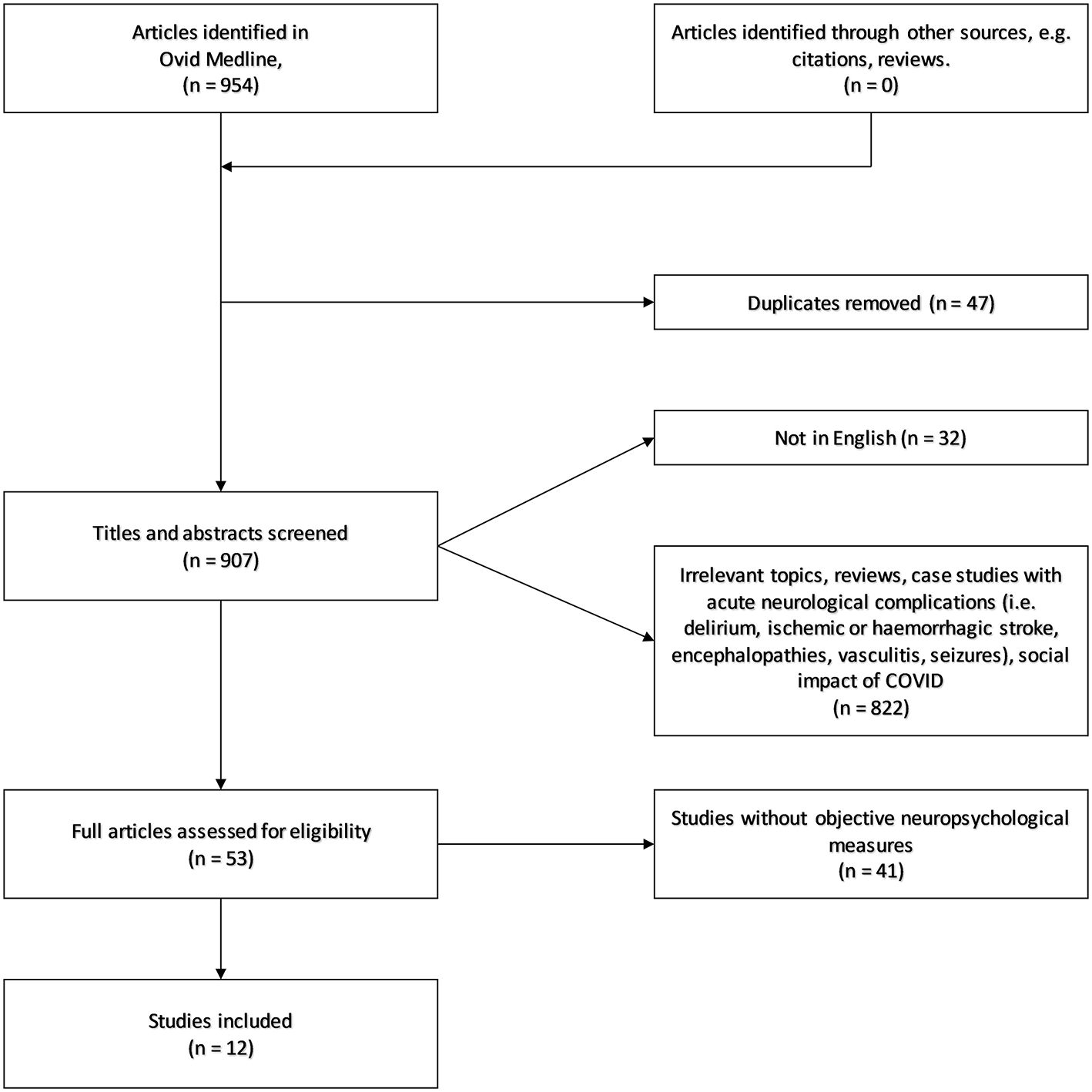 We formulated the search strategy based on PECO scheme (Population/problem; Exposure, Comparison; Outcome) and searched Ovid MEDLINE for studies performed between January 2019 to 16th February 2021. The purpose was to identify human studies on objective cognitive and neuropsychological consequences of COVID-19 in recovered adult patients.