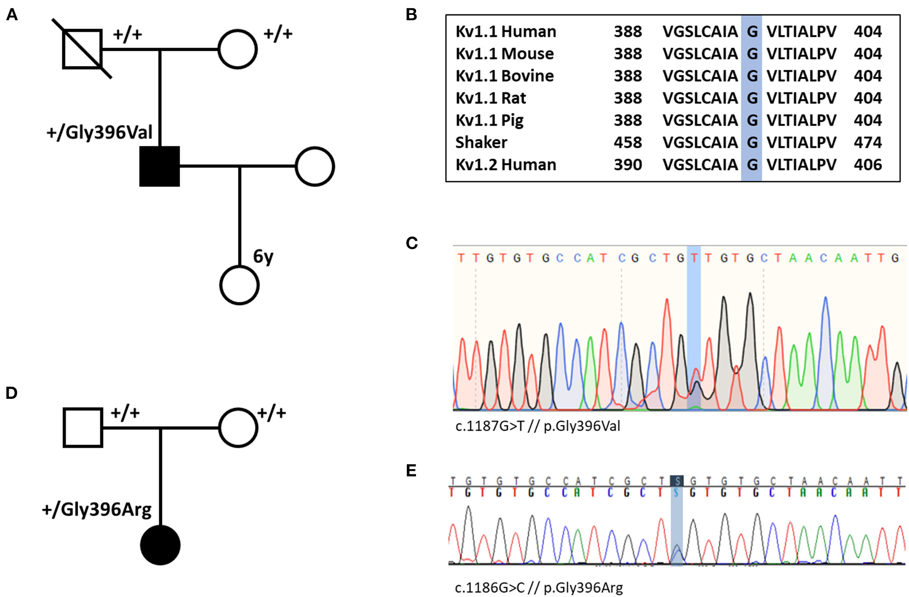 (A) Pedigree of individual #1 shows that the variant p.Gly396Val (p.G396V) is de novo. (B) Amino acid sequence alignment of Kv1.1 subunits across several species and human Kv1.2 subunit demonstrates conservation of the Gly396 residue. (C) Nucleotide sequence with heterozygote substitution of G with T (c.1187G>T) in individual #1. (D) Pedigree of individual #2 demonstrates de novo status of the variant. (E) Nucleotide sequence with heterozygote substitution of G with C in individual #2 (c.1186G>C).