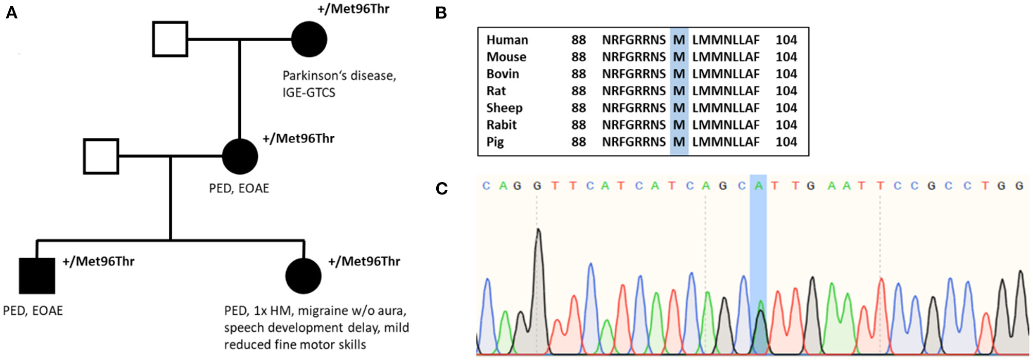 (A) Pedigree of individual #3 shows autosomal dominant inheritance. (B) Amino acid sequence alignment of SLC2A1 across several species demonstrates conservation of the Met96 residue. (C) Nucleotide sequence with substitution of A with G (c.286A>G).