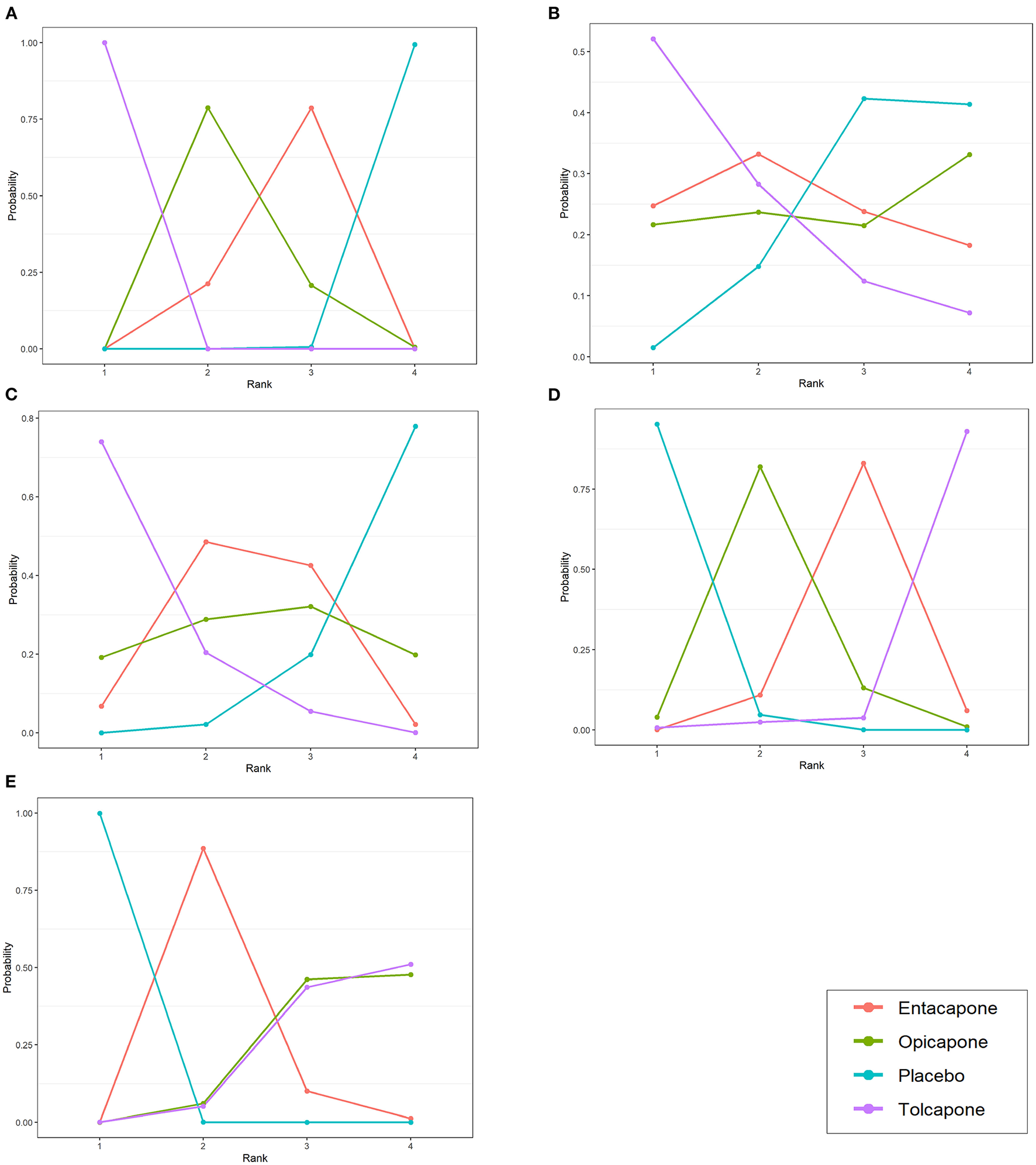 Probability ranks for outcomes of the safety and efficacy generated using the random effects model. (A) Change in total ON-time. (B) Change in UPDRS part-III (motor) score during the on state. (C) Total daily dose of levodopa. (D) Any adverse events. (E) Dyskinesia. The positive results favors mean that drugs with higher rank have better effect or higher safety in treatment.