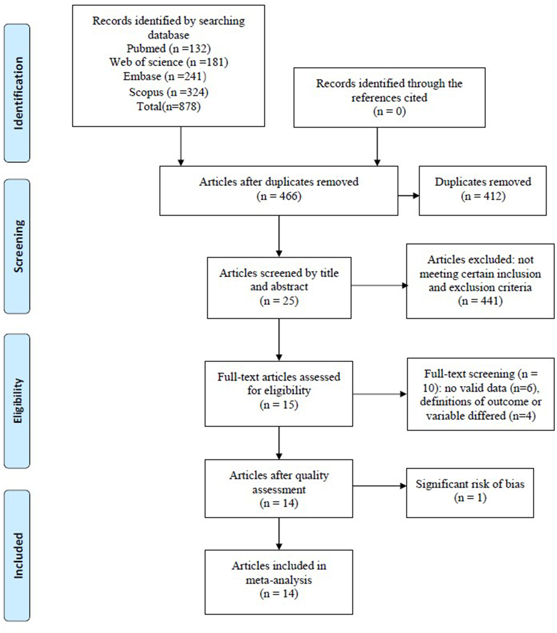 We searched relevant articles in PubMed (n = 132), Web of Science (n = 181), Embase (n = 241), and Scopus (n = 324); a total of 878 relevant articles were retrieved. After excluding 412 duplicate articles, the remaining 466 articles were screened by title and abstract, and 441 articles that did not meet the requirements were excluded. Then, the remaining 25 articles were screened by full-text reading; 10 articles among them did not meet the requirements and were excluded. The remaining 15 articles were assessed for quality, and one of the articles (28) was excluded because it had a significant risk of bias in three items: study participation, study confounding, statistical analysis, and reporting. Finally, 14 articles were included for data extraction, representing a total of 1,619 ALS patients. The results are shown in Figure 2. In the actual review process, we found that different researchers used different blood components (plasma/serum) to measure neurofilament subunit levels (NfL/pNfH), but there were relatively few studies on neurofilament levels in plasma. Therefore, plasma and serum were not distinguished in this meta-analysis. Quality assessment results showed that one study team used different sample sizes from the same cohort to do relevant analyses (14, 29); therefore, we chose the article with the largest sample size and the research purpose more consistent with the theme of this paper for data extraction (14). One study used converted data for analysis (30). In order to exclude the influence of data conversion on the results, we did not include it in the final data extraction. In addition, the definition of disease progression rate (DPR) in the included studies was relatively consistent—that is, DPR = (48-ALSFRS-R at “time of diagnosis”)/duration from onset to diagnosis (months) (31). However, the definition of DPR in one study was significantly different from the other studies (15), and the data from that study were not used in the analysis of the relationship between blood neurofilaments and ALS DPR. After quality evaluation, one study with a high risk of bias was excluded (28).