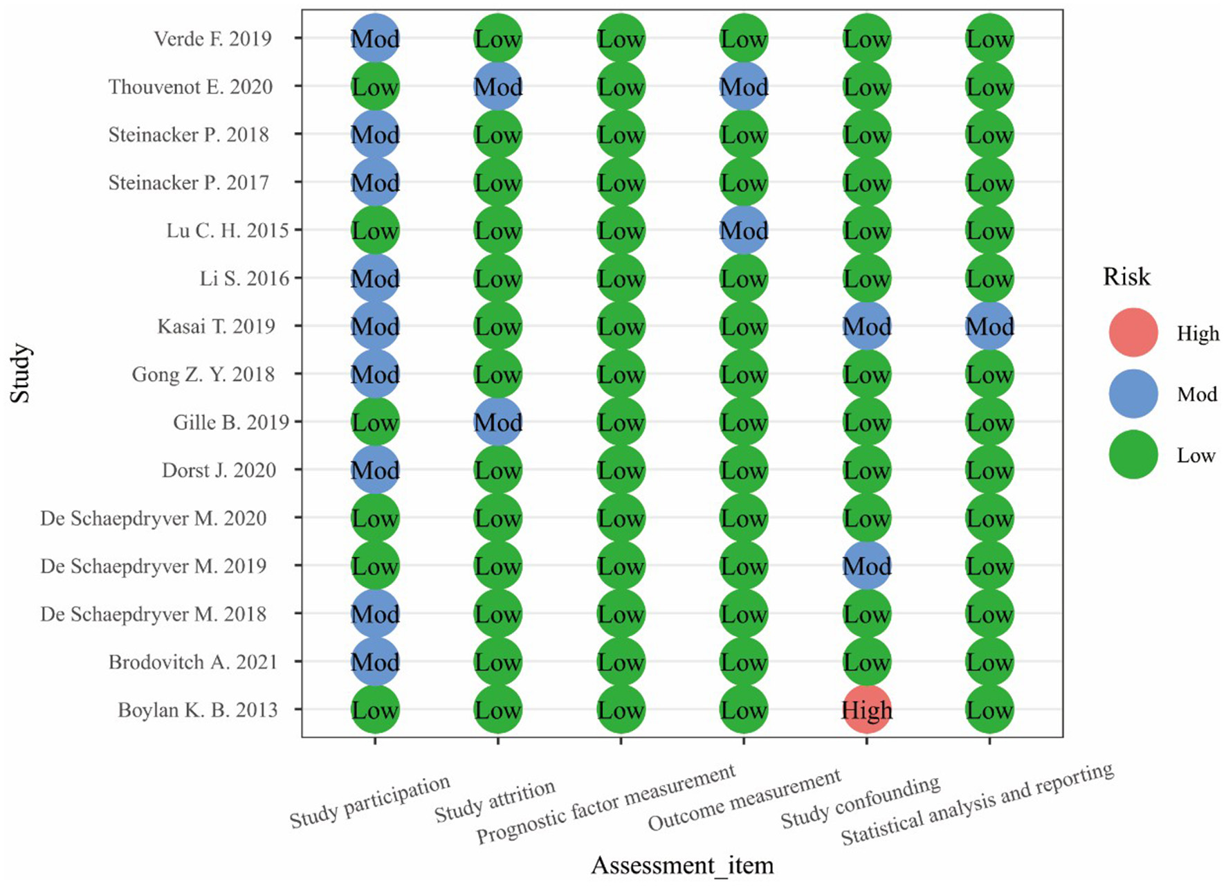 The Quality in Prognosis Studies (QUIPS) scale was used to evaluate the quality of the included studies. This scale included questions related to areas that can inform judgments about the risk of bias in prognostic research (26). The assessment was divided into six items: study participation, study attrition, prognostic factor measurement, outcome measurement, study confounding, statistical analysis, and reporting. Each item was rated as low risk, moderate risk, or high risk. The grade evaluation of each article was carried out independently by two researchers (Siqi Dong and Wenbo Yang), and any inconsistency was resolved by discussion or by a third researcher. Since the QUIPS scale does not provide a uniform, full-text risk-assessment standard, only the risk grades for each item in the included studies were given in this meta-analysis. Studies with a significantly higher risk of bias were excluded.