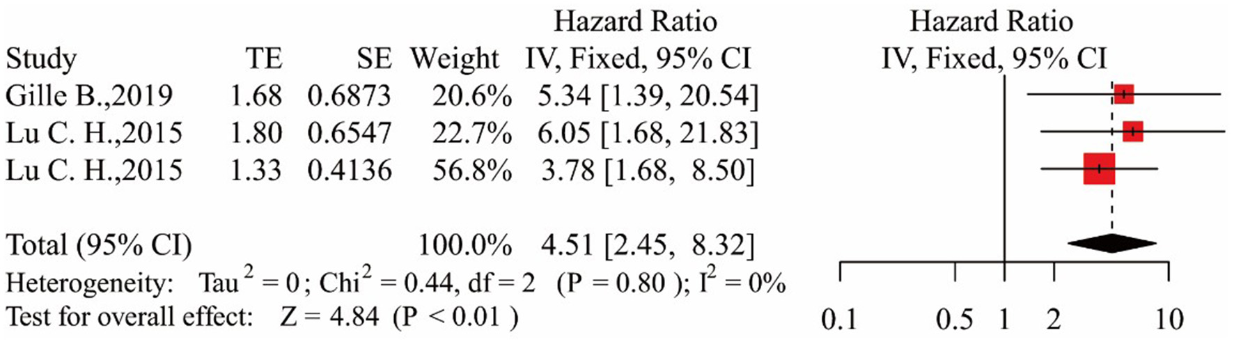 In the three studies, the results showed that patients in the middle NfL group had a higher risk of death than those in the low NfL group [HR = 2.43, 95% CI (1.34–4.39), p < 0.01]. The results are shown in Figure 3. Patients in the high NfL group also had a higher risk of death than patients in the low NfL group [HR = 4.51, 95% CI (2.45–8.32), p < 0.01]. The results are shown in Figure 4. The Egger's test results were all p > 0.05; no obvious bias was found in the funnel plot, and the sensitivity analysis results showed that the relationship between NfL levels and survival was stable (Supplementary Figures 1–4). The remaining two included articles exploring the relationship between serum NfL and ALS patients' survival did not group ALS patients by the tertiles of NfL levels. De Schaepdryver et al. (32) found that HR of serum NfL was 2.21 [95% CI (1.51–3.24), p < 0.0001], and Thouvenot et al. (19) found that patients with serum NfL levels ≥ 71.2 pg/ml had a higher risk of death [HR = 4.7, 95% CI (3.0–7.4), p < 0.0001]. In conclusion, higher levels of NfL in ALS patients' blood were associated with a higher risk of death.