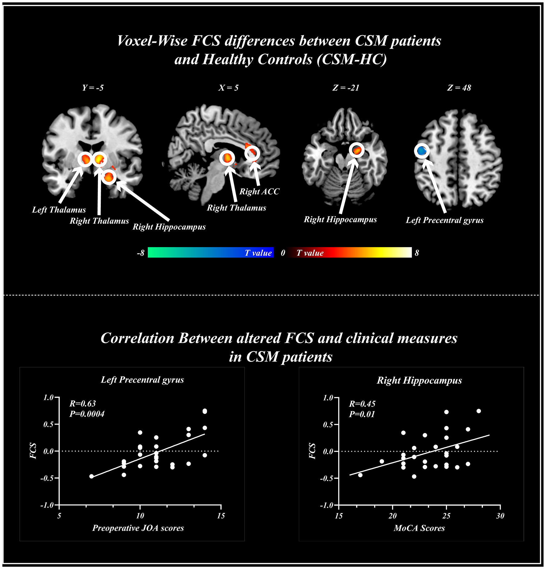 Voxel-wise functional connectivity strength (FCS) changes in cervical spondylotic myelopathy (CSM) patients and healthy patients. Significant difference in FCS was found between the two groups. Scatter plots for the relationship between altered FCS and clinical measures including Montreal cognitive assessments (right), and preoperative Japanese Orthopedics Association scores (Left) across voxels. FCS, functional connectivity strength; ACC, anterior cingulate gyrus.
