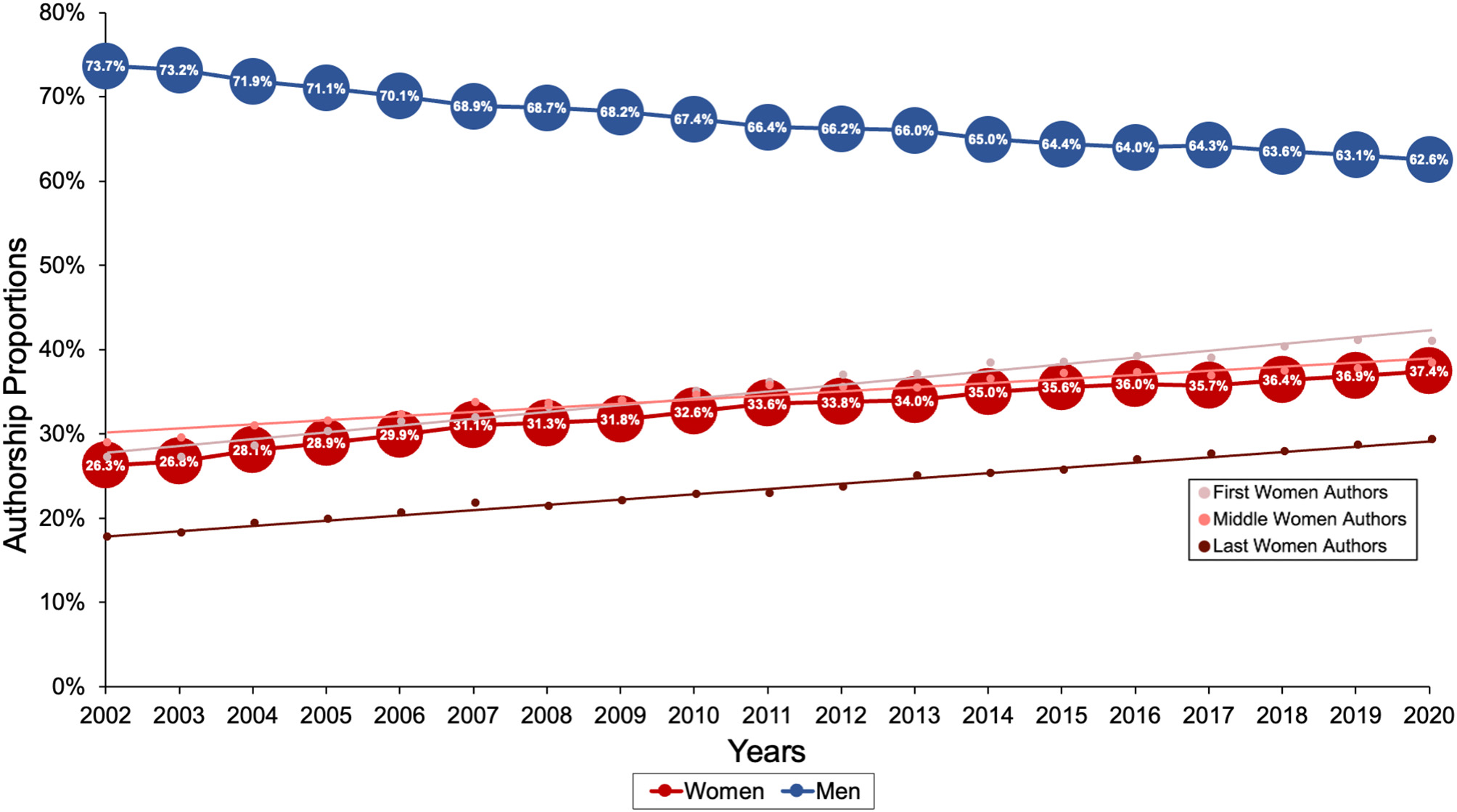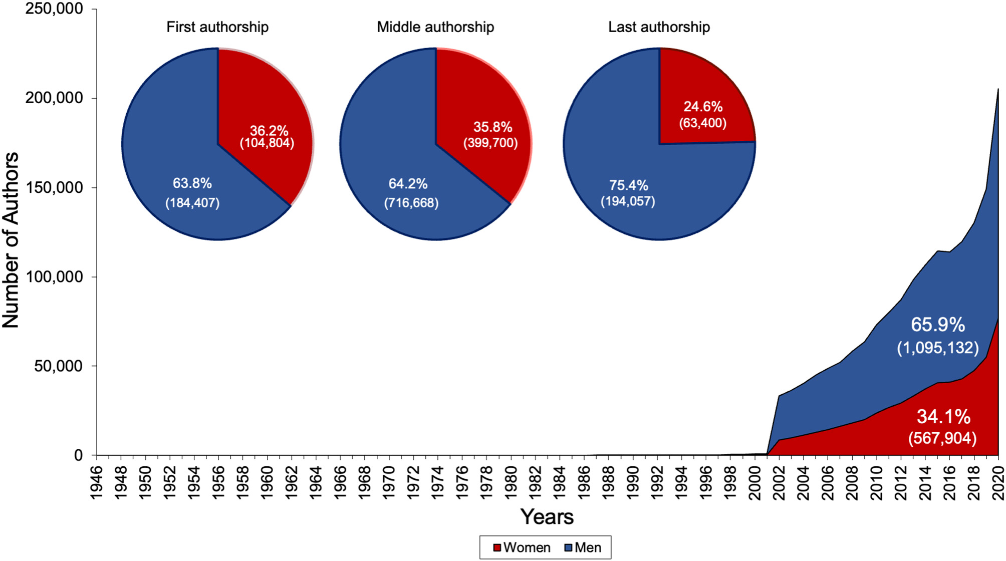 Throughout all years studied, gender and authorship position were associated (chi-square, P < 0.001). The smallest proportion of women authors was among last authors (24.6%; 63,400/257,457 women), followed by middle authors (35.8%; 399,700/1,116,368 women) and then first authors (36.2%; 104,804/289,211 women) (Figure 2).
