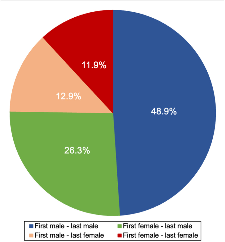 Each author's first name and country of their affiliated institution (if known) were input to Gender-API (https://gender-api.com/) to determine their gender. Gender-API is an application program interface (API) used to classify a person's gender based on their first name and, optionally, their location, for improved accuracy. This proprietary algorithm is built upon combined data from several sources including data from social networks and governmental records that are publicly available (18). It has been proven to be the most accurate gender assignment program with an accuracy exceeding 98.0% (18). It returns the person's gender (man, woman or undetermined), the assignment's accuracy (in percentage) and the sample size (number of records found in Gender-API's database which matches the given input). Authors whose gender was undetermined were excluded from the dataset while the remaining authors whose gender could be determined from the same article were included in the dataset. Despite the use of the term “gender” in this study, it is important to note that it is derived from the author's first name through the use of gender-API.