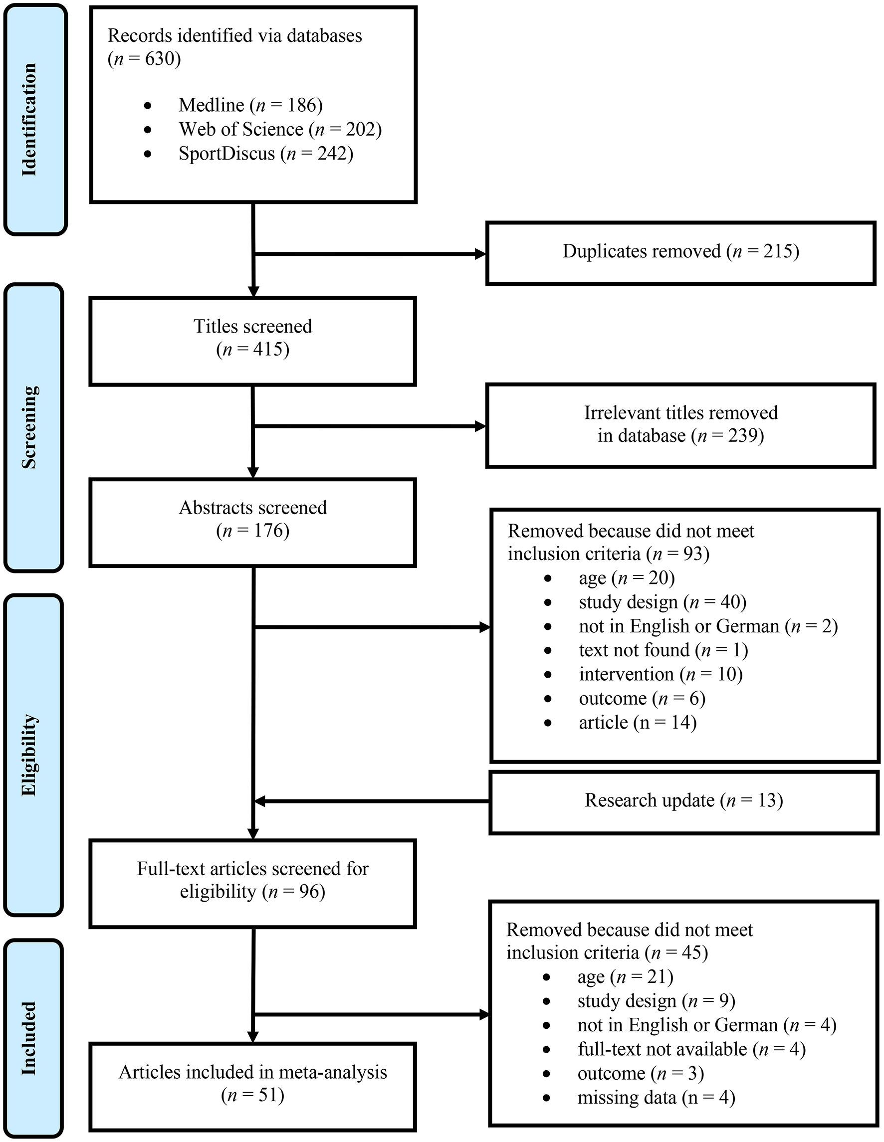 During the search process, 630 potential articles were identified (Figure 1). After removing duplicates, 415 titles were screened for eligibility. After this screening, 176 abstracts remained and were carefully studied regarding the inclusion criteria. After a research update for actuality, another 13 potential studies were included. The remaining 96 full texts were subjected to further review of which 45 were excluded due to exclusion criteria or miss-matching inclusion criteria. Four studies had to be removed due to missing data, meaning a lack of pre- and post-values. Finally, 51 articles were included in the meta-analysis.