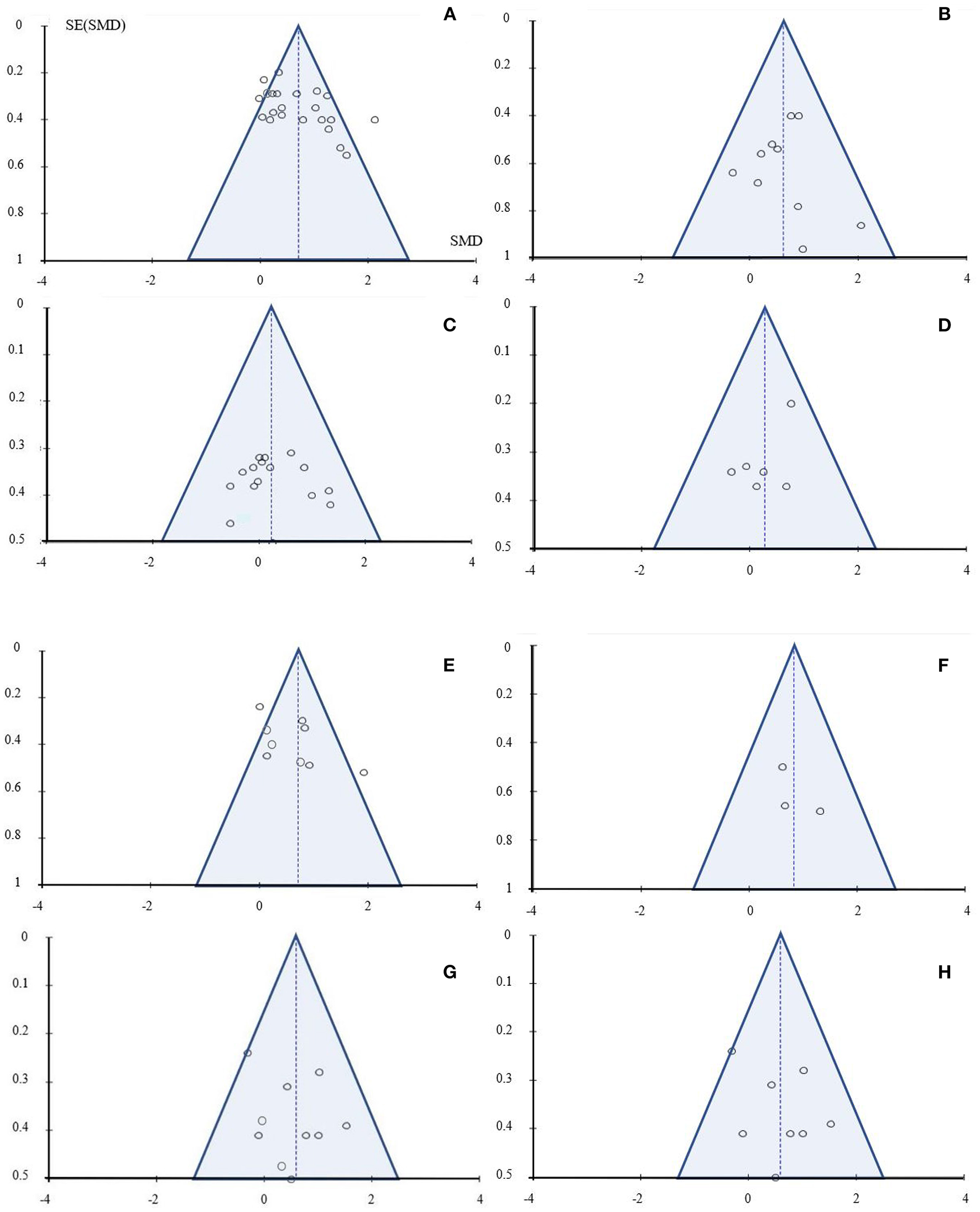Funnel plot: (A) non-clinical condition - physiological health parameters: Pilates vs. IC; (B) non-clinical condition - psychological health parameters: Pilates vs. IC; (C) non-clinical condition - physiological health parameters: Pilates vs. AC; (D) non-clinical condition - psychological health parameters: Pilates vs. AC; (E) clinical condition - physiological health parameters: Pilates vs. IC; (F) clinical condition - psychological health parameters: Pilates vs. IC; (G) clinical condition - physiological health parameters: Pilates vs. AC; (H) clinical condition - psychological health parameters: Pilates vs. AC.