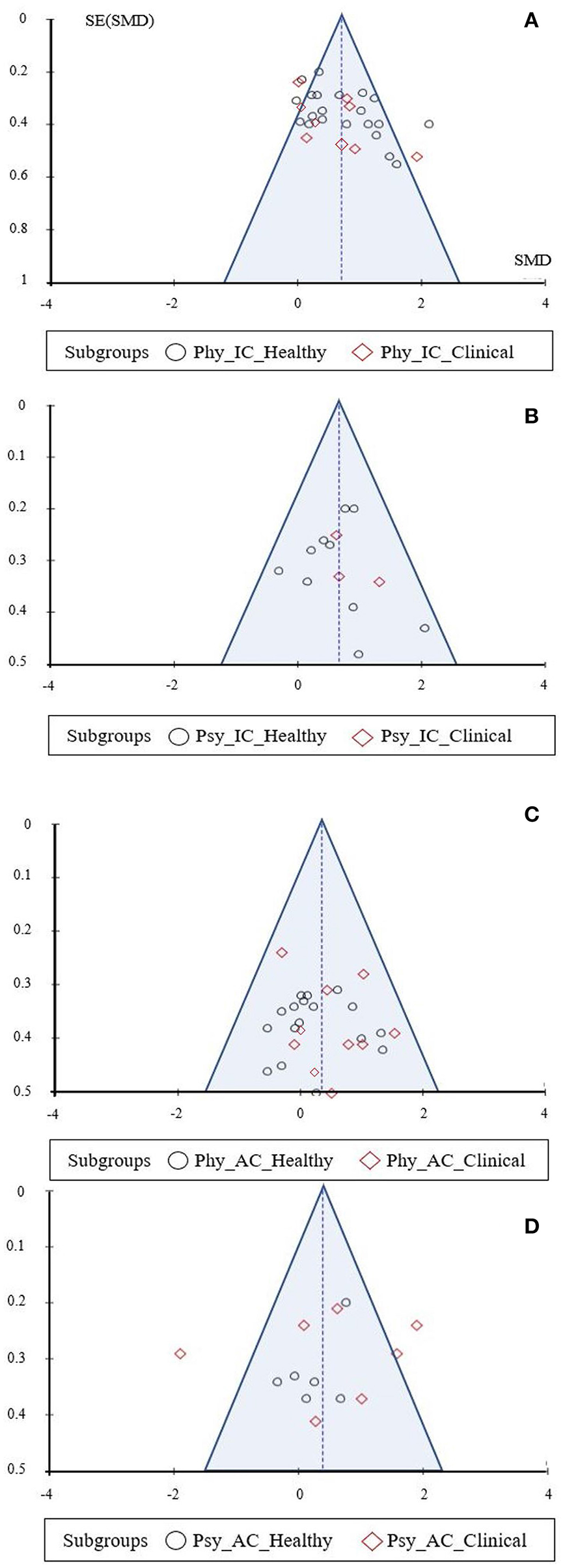 Funnel plot: (A) clinical and non-clinical conditions - physiological health parameters: Pilates vs. IC; (B) clinical and non-clinical conditions - psychological health parameters: Pilates vs. IC; (C) clinical and non-clinical conditions - physiological health parameters: Pilates vs. AC; (D) clinical and non-clinical conditions - psychological health parameters: Pilates vs. AC.