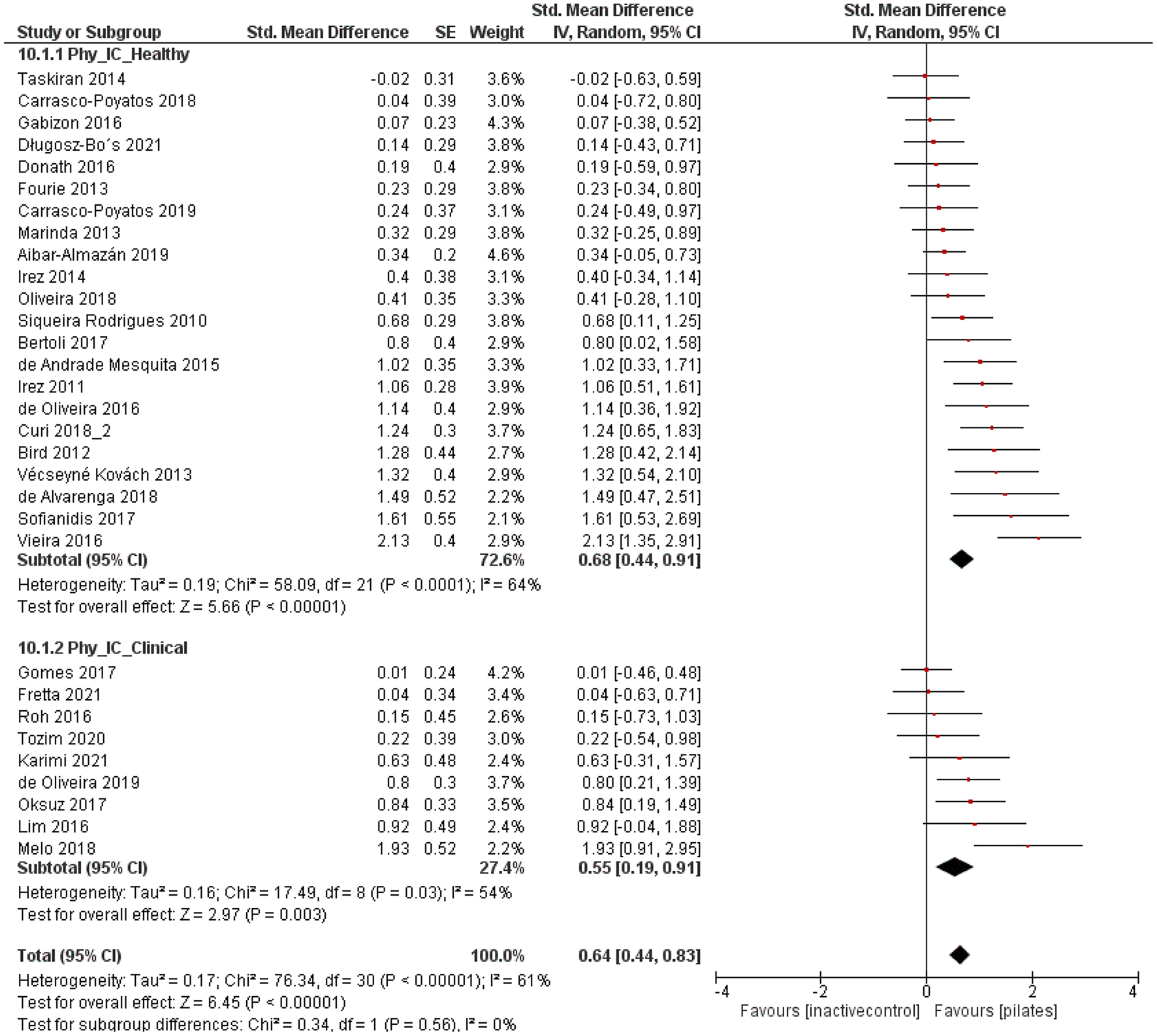 Figure 4. Forest plot of standardized mean effects of Pilates intervention on physiological health parameters compared to inactive control groups. Data are presented for healthy older adults and older adults with clinical conditions. SE, standard error; IV, inverse variance model; CI, confidence interval; Std., standardized.