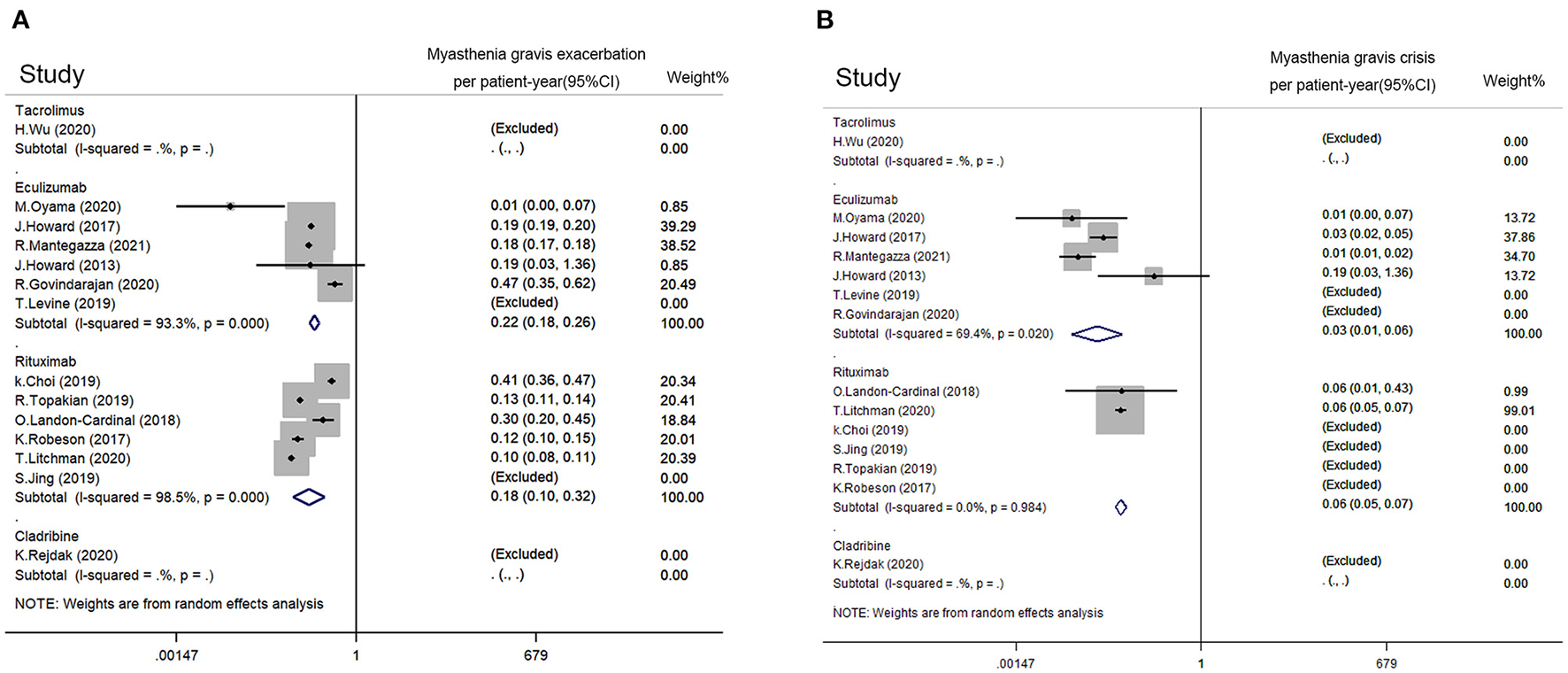Figure 4. Impact from immunotherapies on refractory MG based on disease exacerbation. (A) MG exacerbation rate per patient-year of rituximab, eculizumab, tacrolimus, and cladribine. (B) MG crisis rate per patient-year of rituximab, eculizumab, tacrolimus, and cladribine. MG exacerbation was defined as MG symptoms with increased frequency and/or intensity. Myasthenic crisis was defined as exacerbated MG symptoms that required intubation or rescue therapy such as plasma exchange and intravenous immunoglobulin. A random-effect model was used for quantitative synthesis. No significant difference in frequency of MG exacerbation or crisis between the rituximab group and eculizumab group was revealed. The studies with Tacrolimus and cladribine were excluded since no disease exacerbation or crisis has been reported.