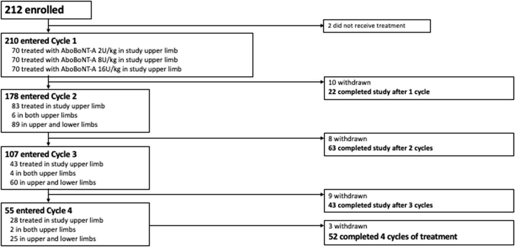 Of the 226 children screened, 212 were randomized to treatment and 210 received ≥ 1 aboBoNT-A injection and were included in this analysis. Baseline characteristics for the overall population are provided in Table 1. Overall, 56.7% of children were aged 2–9 years and 76.9% had hemiparesis. A total of 210 children entered Cycle 1, 178 entered Cycle 2, 107 entered Cycle 3 and 55 entered Cycle 4 (Figure 1). The mean time to retreatment was 24.7 weeks following the cycle 1 injection (8 U/kg and 16 U/kg groups combined), 19.4 following the cycle 2 injection and 17.4 weeks following the cycle 3 injection (9).
