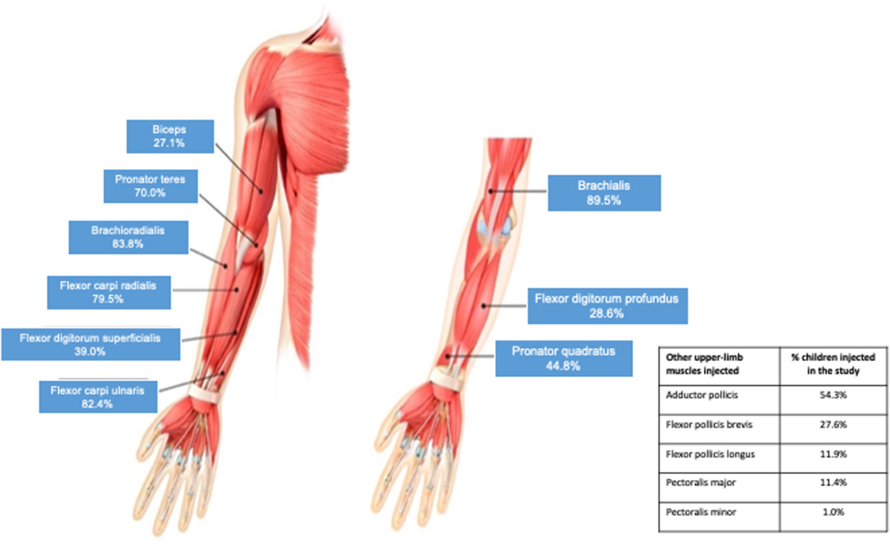 Results: 212 children were randomized, of which 210 received ≥1 abobotulinumtoxinA injection. Per protocol, the elbow and wrist flexors were the most commonly injected upper limb muscles. Across all 4 cycles, the brachialis was injected in 89.5% of children (dose range 0.8–6 U/kg), the brachioradialis in 83.8% (0.4–3 U/kg), the flexor carpi ulnaris in 82.4% (0.5–3 U/kg) and the flexor carpi radialis in 79.5% (0.5–4 U/kg). Other frequently injected upper limb muscles were the pronator teres(70.0%, 0.3–3 U/kg). adductor pollicis (54.3%, 0.3-1 U/kg), pronator quadratus (44.8%, 0.1–2 U/kg), flexor digitorum superficialis (39.0%, 0.5-4 U/kg), flexor digitorum profundus (28.6%, 0.5–2 U), flexor pollicis brevis/opponens pollicis (27.6%, 0.3-1 U/kg) and biceps (27.1%, 0.5–6 U/kg). AbobotulinumtoxinA was well-tolerated at these doses; muscular weakness was reported in 4.3% of children in the 8 U/kg group and 5.7% in the 16 U/kg group.