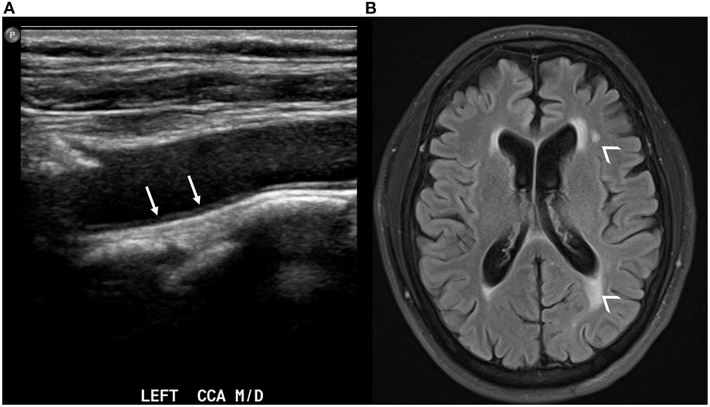 Carotid ultrasound demonstrating thickening of the intima-media in the left common carotid artery [(A), white arrows]. The same patient also has evidence of white matter hyperintensities in the periventricular white matter on axial T2 FLAIR brain MRI [(B), small arrowheads].