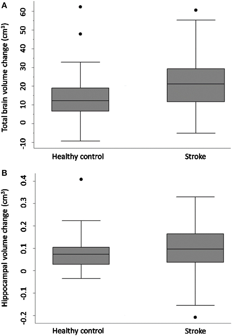 Results: Ninety-three stroke (26 women, 66.7 ± 12 years) and 39 control participants (15 women, 68.7 ± 7 years) were available at 3 years. TBV loss in stroke patients was greater than controls: stroke mean (M) = 20.3 cm3 ± SD 14.8 cm3; controls M = 14.2 cm3 ± SD 13.2 cm3; [adjusted mean difference 7.88 95%CI (2.84, 12.91) p-value = 0.002]. TBV decline was greater in those stroke participants who were cognitively impaired (M = 30.7 cm3; SD = 14.2 cm3) at 3 months (M = 19.6 cm3; SD = 13.8 cm3); [adjusted mean difference 10.42; 95%CI (3.04, 17.80), p-value = 0.006]. No statistically significant differences in HV change were observed.