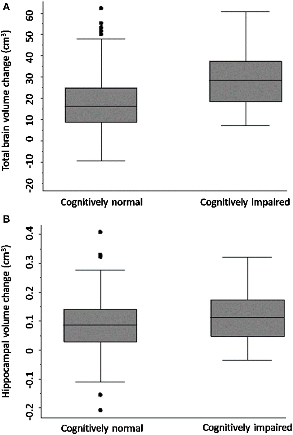 We note that a threshold of z-score >−1.5 is a standard cut-point for most neuropsychological tests, as an accepted threshold for decline or impairment for those tests with extensive normative data. While continuous z-scores may be better approach for assessing cognitive trajectories and longitudinal change, we emphasise that the 3-month allocation was a cross-sectional one to divide the groups into impaired/not impaired, therefore allowing examination of the association between early cognitive impairment and 3-year brain volume change.