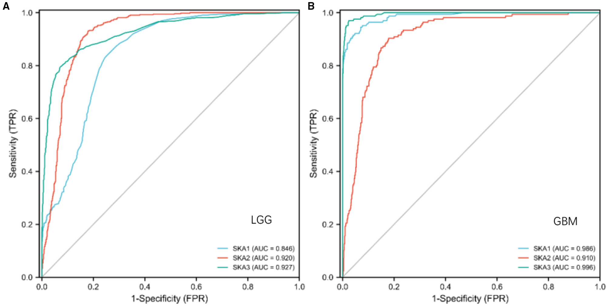 The diagnostic values of SKA complex in patients with gliomas. (A) LGG; (B) GBM.