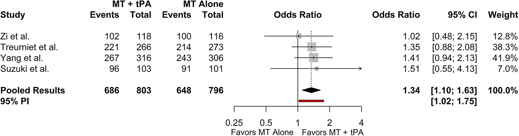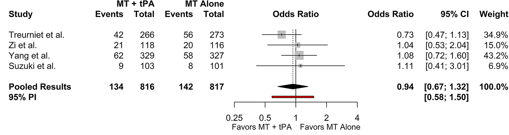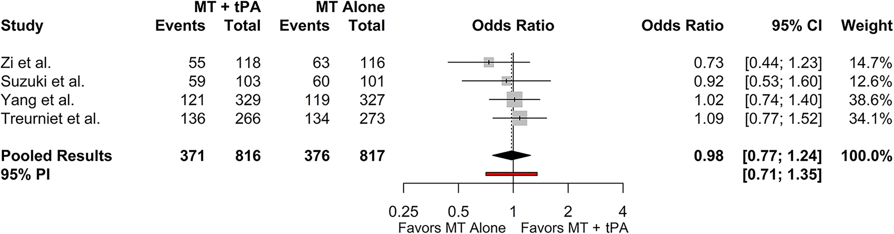 Results: We subjectively found Nested Knowledge to be highly streamlined and effective at sourcing the correct literature. Four studies with 1,633 patients, 816 in the MT+tPA arm and 817 in the MT arm, were included in the meta-analysis. In each study, patient populations consisted of only tPA-eligible patients and all imaging and clinical outcomes were adjudicated by an independent and blinded core laboratory. Compared to MT alone, patients treated with MT+tPA had higher odds of eTICI ≥2b (OR = 1.34 [95% CI: 1.10; 1.63]). However, there were no statistically significant differences in the rates of 90-day mRS 0-2 (OR = 0.98 [95% CI: 0.77; 1.24]), 90-day mortality (OR = 0.94 [95% CI: 0.67; 1.32]), distal emboli (OR = 0.94 [95% CI: 0.25; 3.60]), or sICH (OR = 1.17 [95% CI: 0.80; 1.72]).