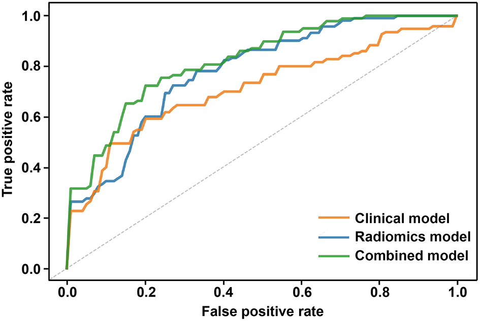 Figure 2. Comparison of ROC curves based on 5-fold cross-validation among the three models. The clinical model is marked with an orange curve, and the AUC is 0.71 (95% CI 0.62–0.80). The radiomics model is marked with a blue curve, and the AUC is 0.78 (95% CI 0.71–0.85). The combined model is marked with a green curve, and the AUC is 0.82 (95% CI 0.74–0.90).