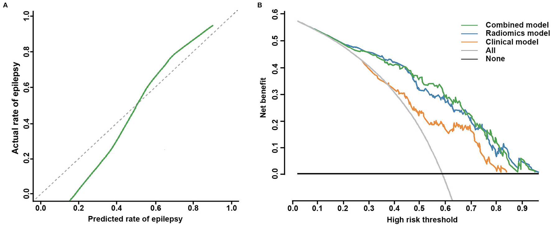 The clinical utility of the 3 models was all evaluated, DCA was performed by quantifying the net benefits under different threshold probabilities. The DCA showed that the combined model had a higher overall net benefit in predicting epilepsy than the clinical model and the radiomics model across a large range of reasonable threshold probabilities, which demonstrated that the combined model had a relatively good performance in terms of clinical application (Figure 4B).