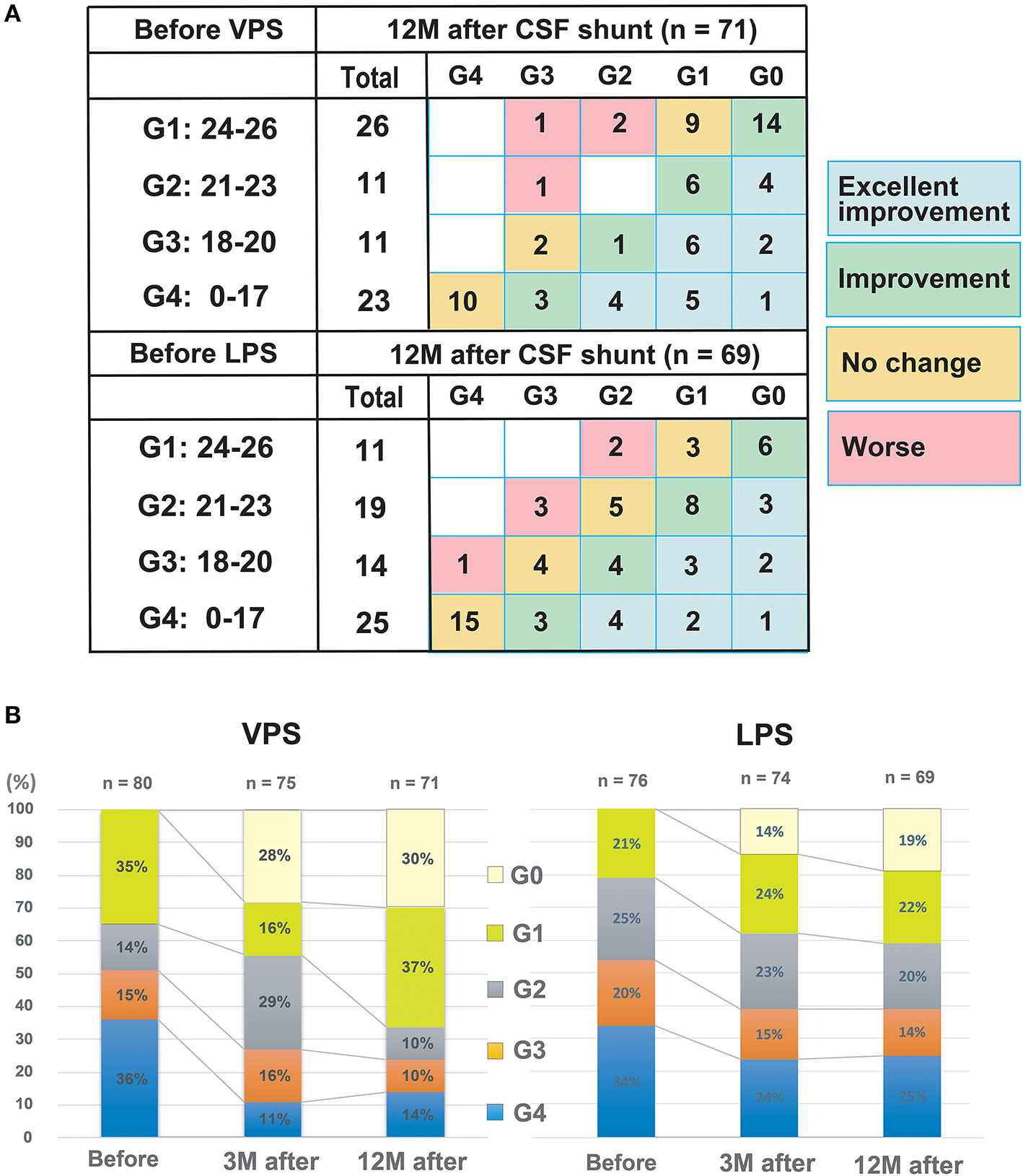 The CSF shunt resulted in a better MMSE score of “improved” or above after 12 months in 81 among 140 subjects (57.8%) (Figure 4A). Twenty-five of 48 subjects (52%) did not fit the G4 classification at 12 months following CSF shunt placement. In other words, approximately half of those in G4 demonstrated improved cognitive function. In G2, improvements were observed in 21 of 30 subjects (70%). Moreover, 18 of 25 subjects (72%) in G3 demonstrated cognitive improvements. In G1, while 20 of 37 subjects (54.1%) revealed improved cognitive function after 12 months, five (13.5%) revealed worsened cognition. The degree of improvement due to the difference in VPS and LPS shunt was not statistically significant.