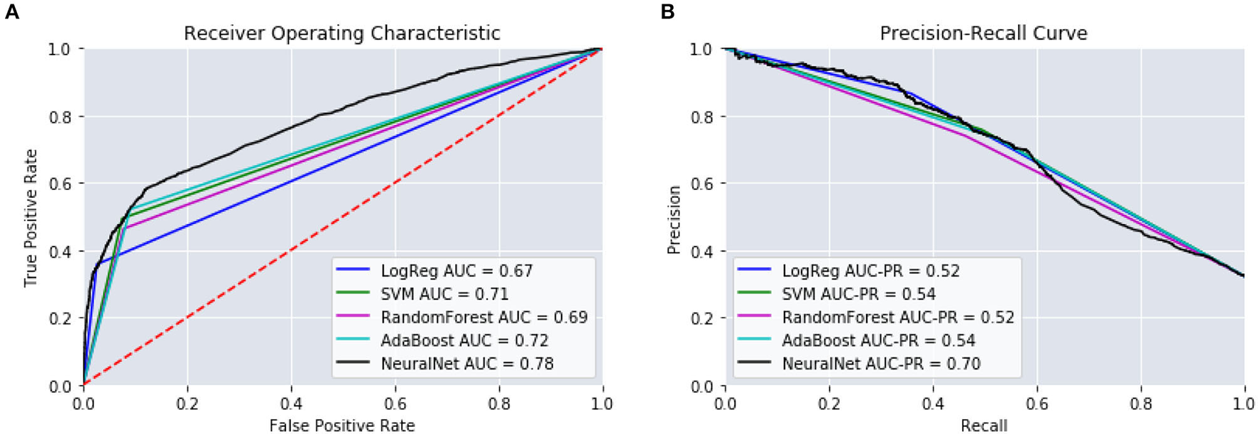 Figure 4. Different model types and their performance using window configuration C on predicting 14–365 days. (A) ROC Curves. (B) Precision-Recall Curves.