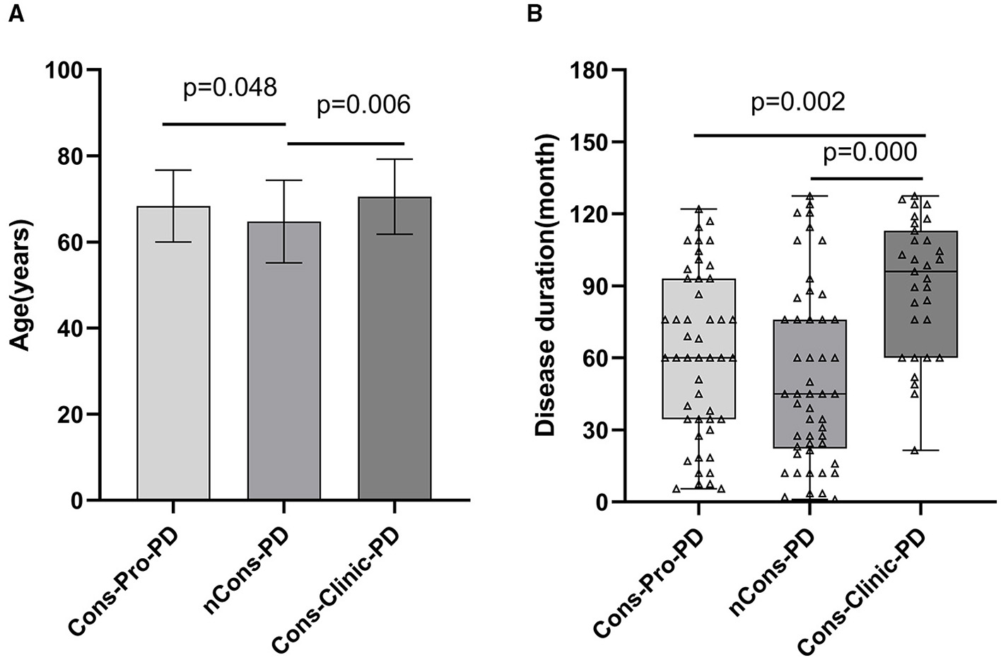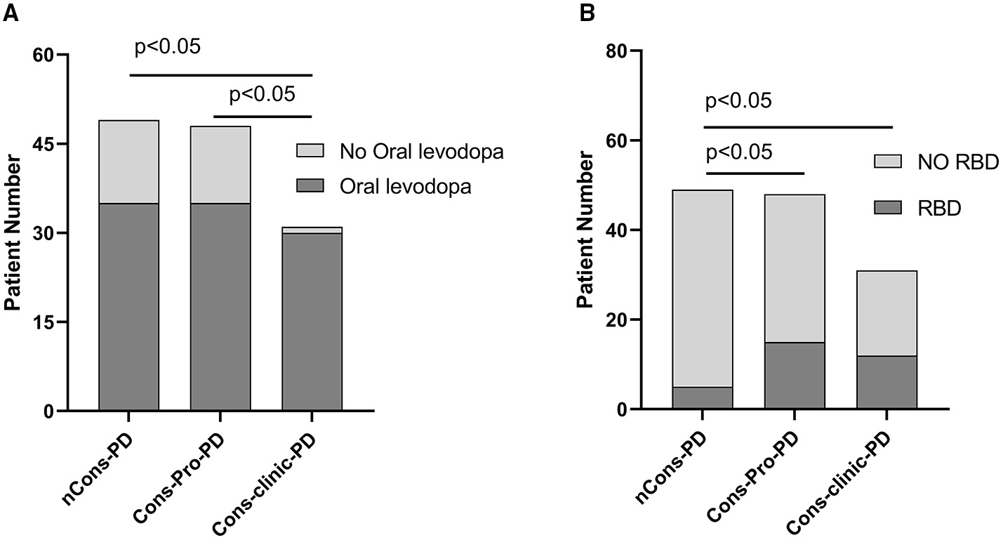 (A) compares the ages of the three groups pairwise. The mean age of the nCons-PD group was 64.73 years (SD 9.565, Range 43–82), which was less than that of the Cons-Pro-PD group 68.35 years (SD 8.353, range 49–82, p = 0.048) and Cons-Clinic-PD groups 70.52 years (SD8.733, range 51–87, p = 0.006), with no statistically significant difference between Cons-Pro-PD and Cons-Clinic-PD groups (p > 0.05). (B) shows that the median course of disease in the Cons-Clinic-PD group (M 88 months, QR 48–125) was longer than that of the Cons-Pro-PD group (M 48 months, QR 24–84, p = 0.002) and the nCons-PD group (36 months, QR 15.5–60, p = 0.000), but there was no significant difference in the course of disease between the Cons-pro-PD and nCons-PD groups (p > 0.05).