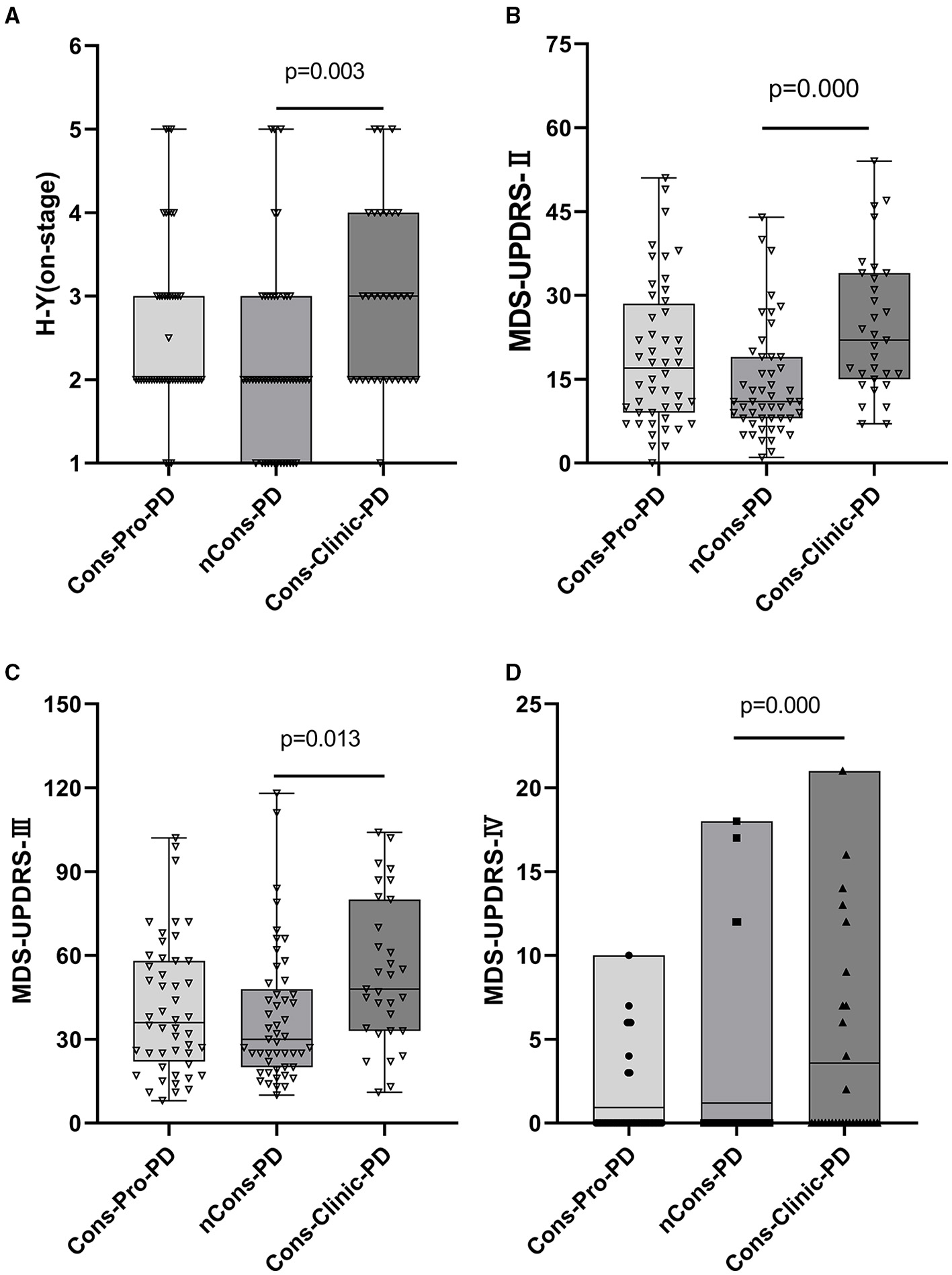 (A) Shows that H-Y staging in the three groups is compared. Cons-Clinic-PD had a higher median H-Y staging (M 3, QR 2–4) than the nCons-PD group (M 2, QR 1–3, p = 0.003), with no substantial difference in H-Y staging between Cons-pro PD (M 2, QR 2–3) and the nCons-PD group (p > 0.05). MDS-UPDRS-II, MDS-UPDRS-III, and MDS-UPDRS-IV total scores were not equal among the three groups (p < 0.05). The median MDS-UPDRS-II (M 22, QR 15–34), MDS-UPDRS-III (M 48, QR33–80), and mean MDS-UPDRS-IV (M 3.58, range 0–21) of the Cons-Clinic-PD category were all higher compared with MDS-UPDRS-II (M 11, QR 8–19 p = 0.000) (B) MDS-UPDRS-III (M 30, QR 20–48, p = 0.013) (C) and MDS-UPDRS-IV (M 1.204, range 0–18) (D). There was no substantial difference between the Cons-pro-PD group and the nCons-PD group (p > 0.05) or the Cons-Clinic-PD group (p > 0.05).