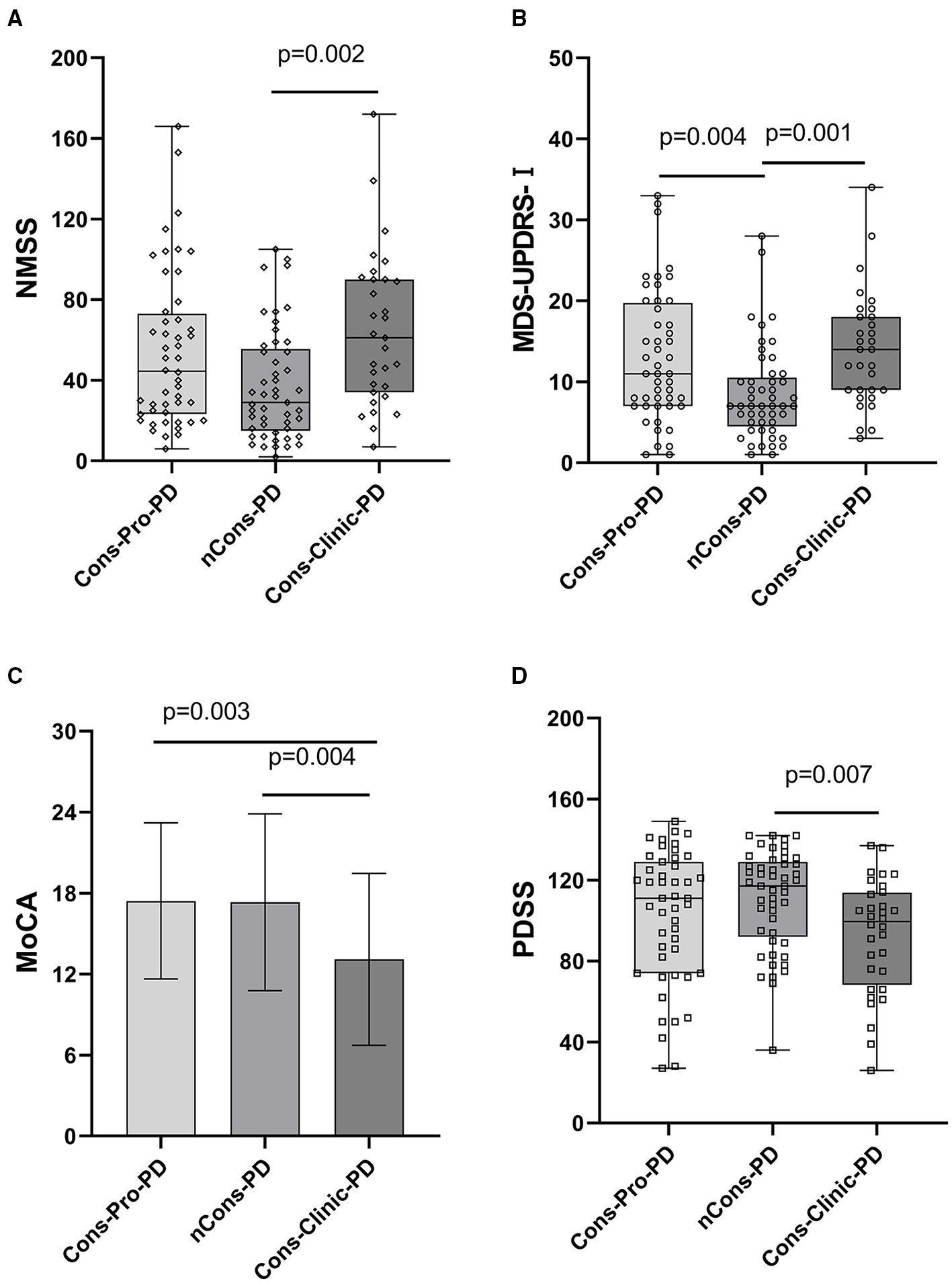 (A) Revealed that the median NMSS score of the Cons-Clinic-PD group (M 61,QR 34–90) was higher than that of the nCons-PD group (M 29,QR 15–55.5, p = 0.002), although no statistically significant difference was observed in nCons-PD (M 29, QR 15–55.5, p > 0.05) and Cons-Clinic-PD (M 61, QR 34–90 p > 0.05). (B) Revealed that the median MDS-UPDRS-I in the nCons-PD group (M 7,QR 4.5–10.5) was lower than in the Cons-Pro-PD group (M 11, QR 7–19.75, p = 0.004) and Cons-Clinic-PD group (p = 0.001), and no statistical difference was found between the Cons-pro-PD and Cons-clinic-PD groups (P > 0.05). (C) Indicates that the mean MoCA of the Cons-Clinic-PD group was 13.10 (SD 6.37) lower than the Cons-Pro-PD group, which was 17.42 (SD 5.78 p = 0.003) and 17.33 (SD 6.56, p = 0.004). There was no substantial difference in the course of disease between the Cons-pro-PD and nCons-PD groups (p > 0.05). (D) Revealed that the median PDSS score of the Cons-Clinic-PD group (M 98,QR 66–113) was lower than the nCons-PD group (M 117, QR 92–129, p = 0.007), and no statistically significant difference was observed in nCons-PD (M117, QR 92–129 p > 0.05) and Cosn-Clinic-PD (M 98, QR 66–113, p > 0.05).