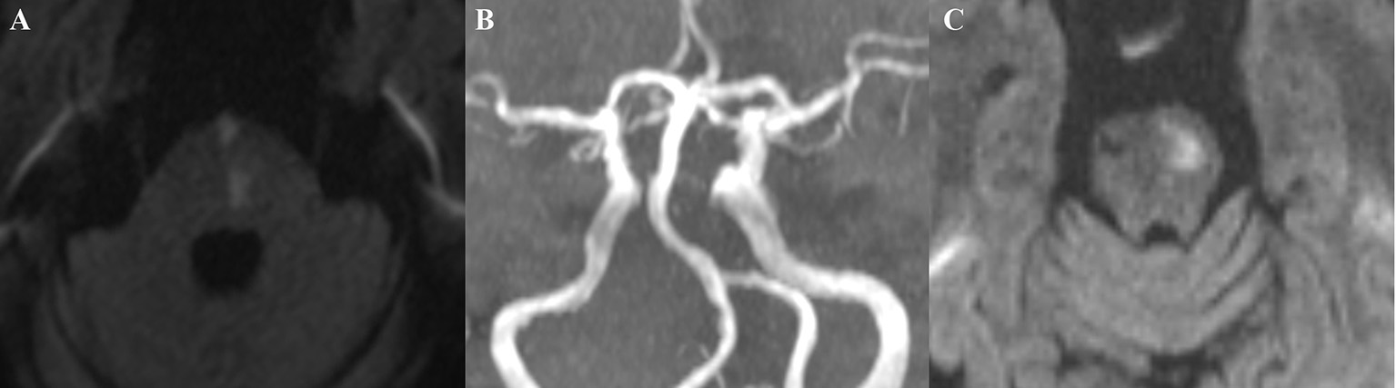 A typical case: This patient, a 69-year-old man with a history of hypertension and diabetes mellitus, was admitted to our hospital with right upper and lower extremity weakness for two days (Medical Research Council scale, grade IV). DWI showed left paramedian pontine infarction (middle pontine) (A); MRA did not reveal basilar artery stenosis, while BA dolichosis and moderate curvature were noted (B). The patient's muscle strength returned to normal after treatment. Four years later, the patient again developed weakness in the right upper and lower extremities, and a repeat DWI suggested the left basal infarction of upper pontine (C).