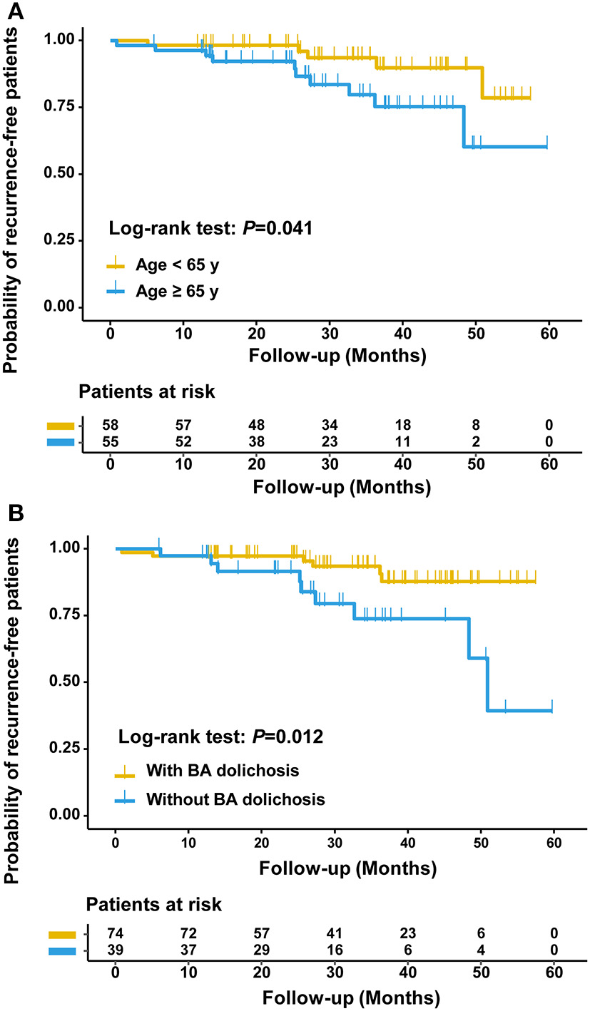 Kaplan-Meier curves estimating the probability of being recurrence-free between patients aged ≥65 years and aged <65 years (A) and between patients with and without BA dolichosis (B).