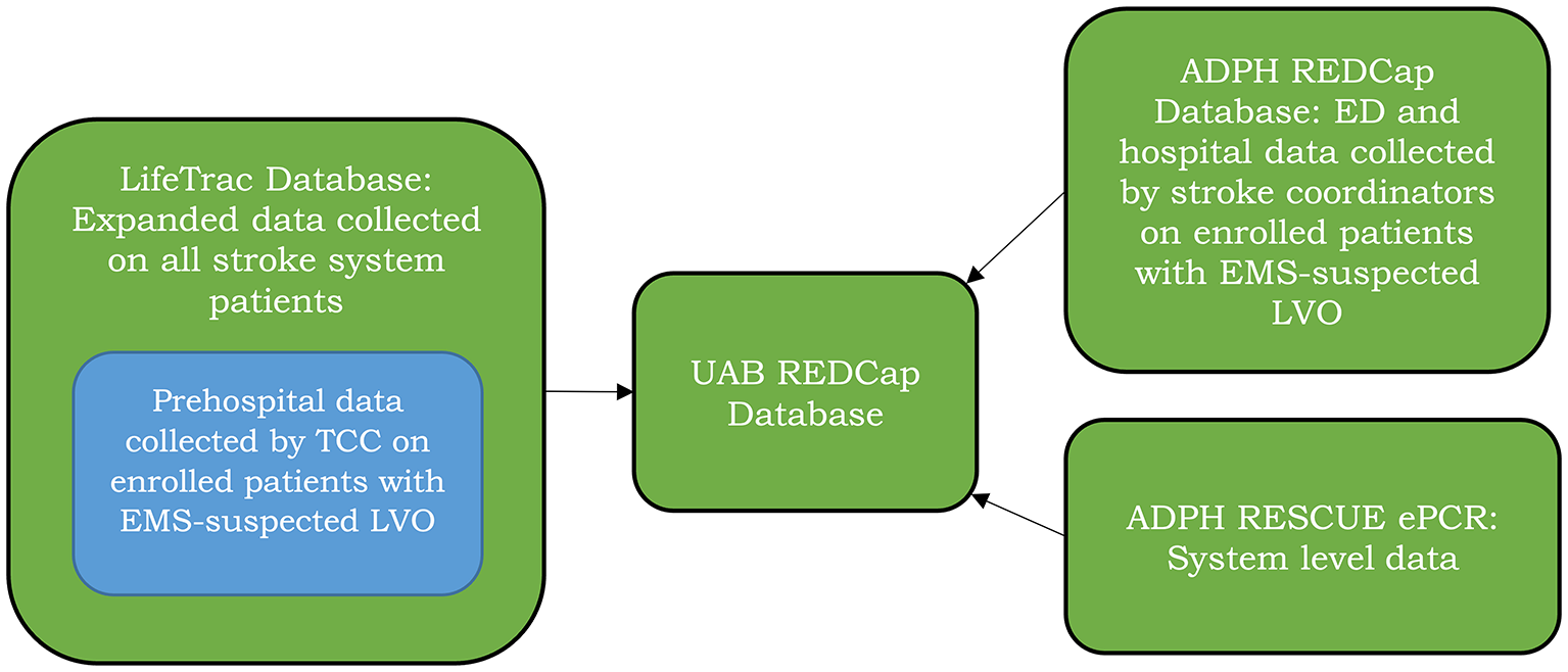 Data sources. (1) Expanded LifeTrac data entry on all stroke system patients with embedded LifeTrac data collection by TCC on study patients to both guide and document the prehospital triage process in real-time; (2) Study patient ED and hospital data entered by stroke coordinators into an ADPH REDCap database, and (3) System level data captured by ADPH's Recording of Emergency Medical Services Calls and Urgent-care Environment electronic Patient Care Reports (ADPH RESCUE ePCR).