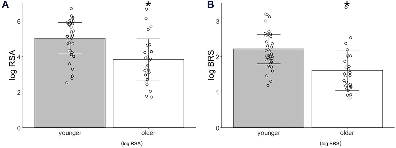 Autonomic activity index associated with age. (A) Logarithm-transformed respiratory sinus arrhythmia (logRSA). (B) Logarithm-transformed baroreflex sensitivity (logBRS). Values are shown as mean ± standard deviation, *p < 0.05 vs. younger.