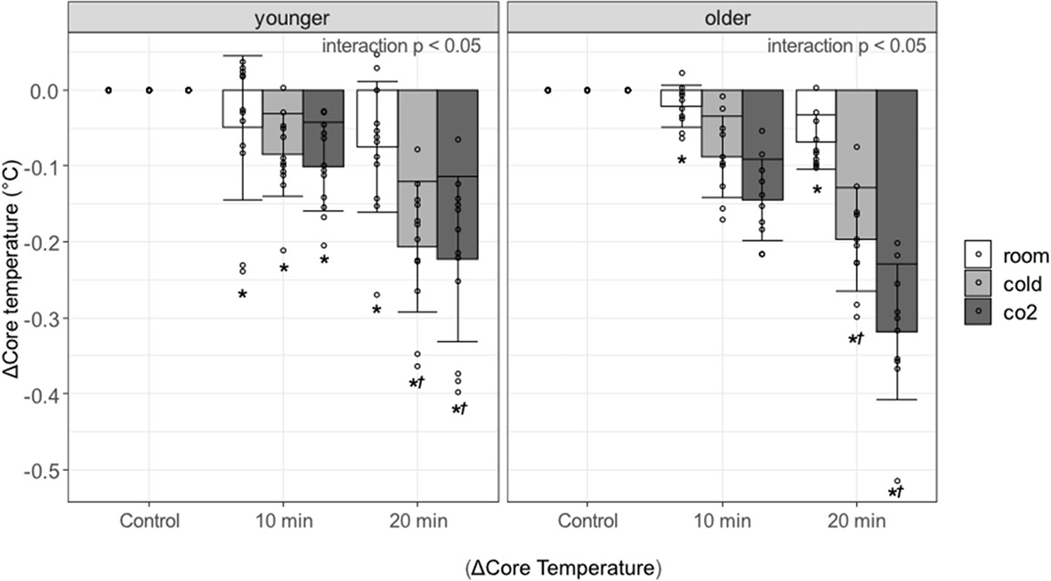 Changes in core temperature against control period, associated with age, type of water, and period. Values are shown as mean ± standard deviation, *p < 0.05 vs. control period, †p < 0.05 vs. room.