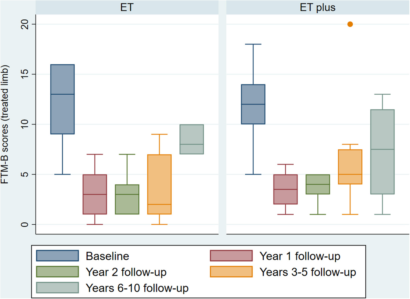 ET vs. ET-plus outcomes. Boxplot of baseline and follow-up FTM-B scores at 1, 2, 3–5 and 6–10 years for the treated limbs of ET and ET-plus patients. One patient in the ET plus group lost benefit from DBS at 3–5 years, shown as the outlier. (ET, essential tremor; ET plus, essential tremor plus; FTM-B, Fahn-Tolosa-Marin Tremor Rating Scale-Part B).