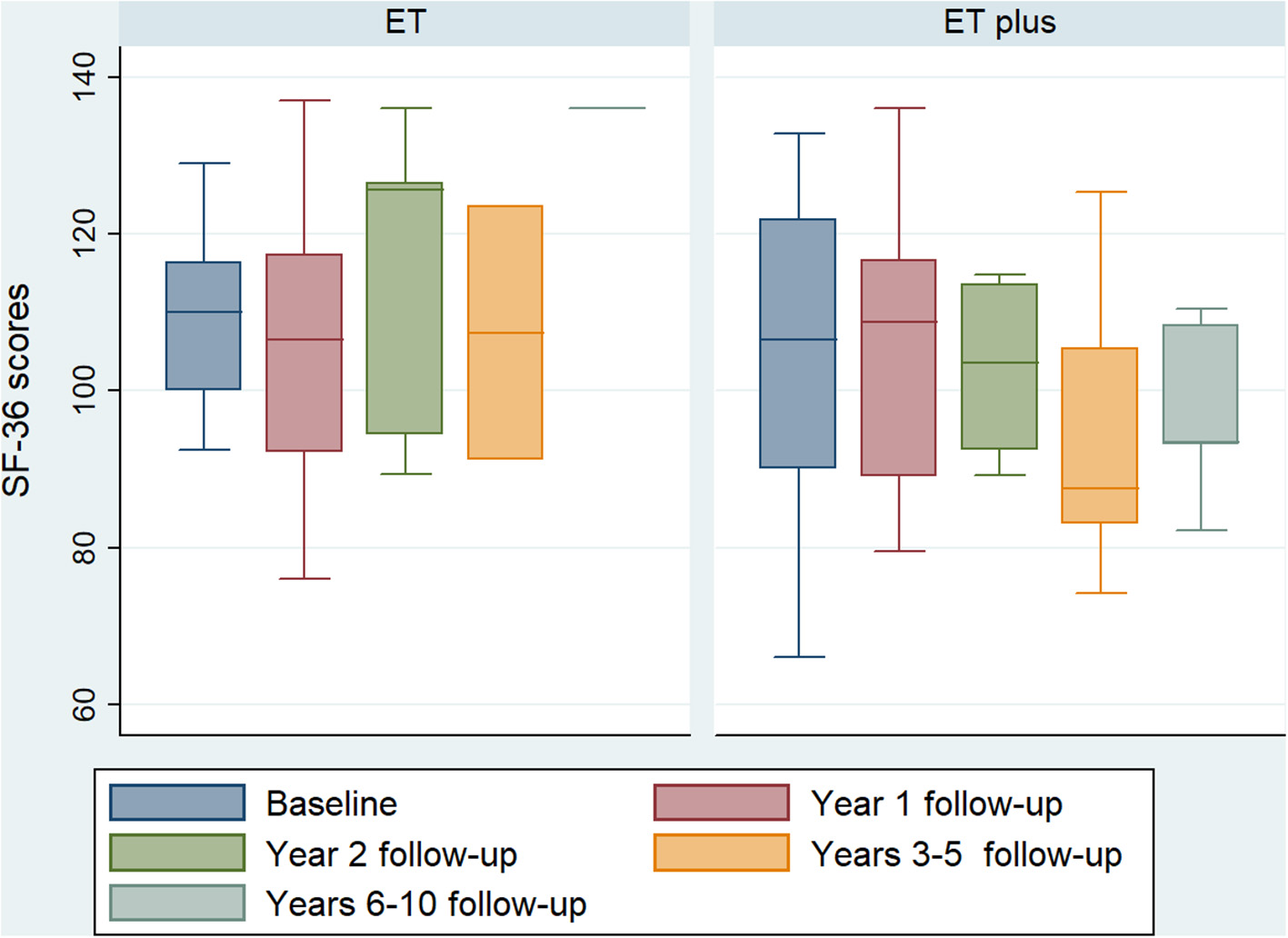 The Friedman test (repetitive measures), conducted to examine the change in FTM-B in each follow-up, showed no statistically significant differences in the FTM-B scores between follow-ups between patients (Q(3) = 6.14, p = 0.10), or when stratifying by ET or ET-plus (Q(3) = 6.57, p = 0.09).