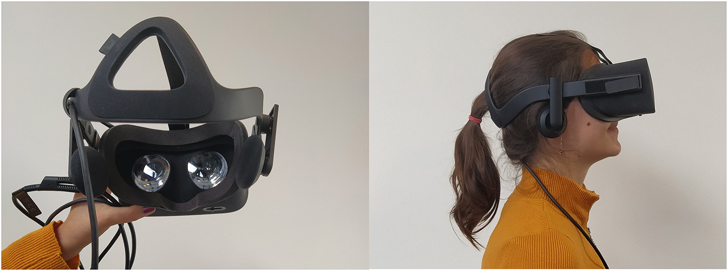 Representation of a head-mounted display (HMD, HTC Vive, New Taipei City, Taiwan) with an integrated binocular eye tracker measuring at 250 Hz (SensoMotoric Instruments). The picture shows a staff member of the working group and thus not a study subject.